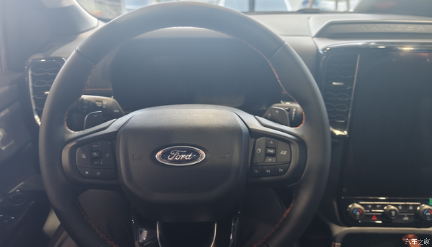 造型更像是一台家用SUV的风格,硬朗中带有一些档次感,可见新车还是保持着Ranger的专业与高端越野皮卡的定位,与马路上随处可见的工具皮卡是完全不同的。大面积皮质包裹搭配12.3英寸数字仪表和12.1英寸全液晶触控屏以及电子挡杆,新车呈现出的科技感够强。
