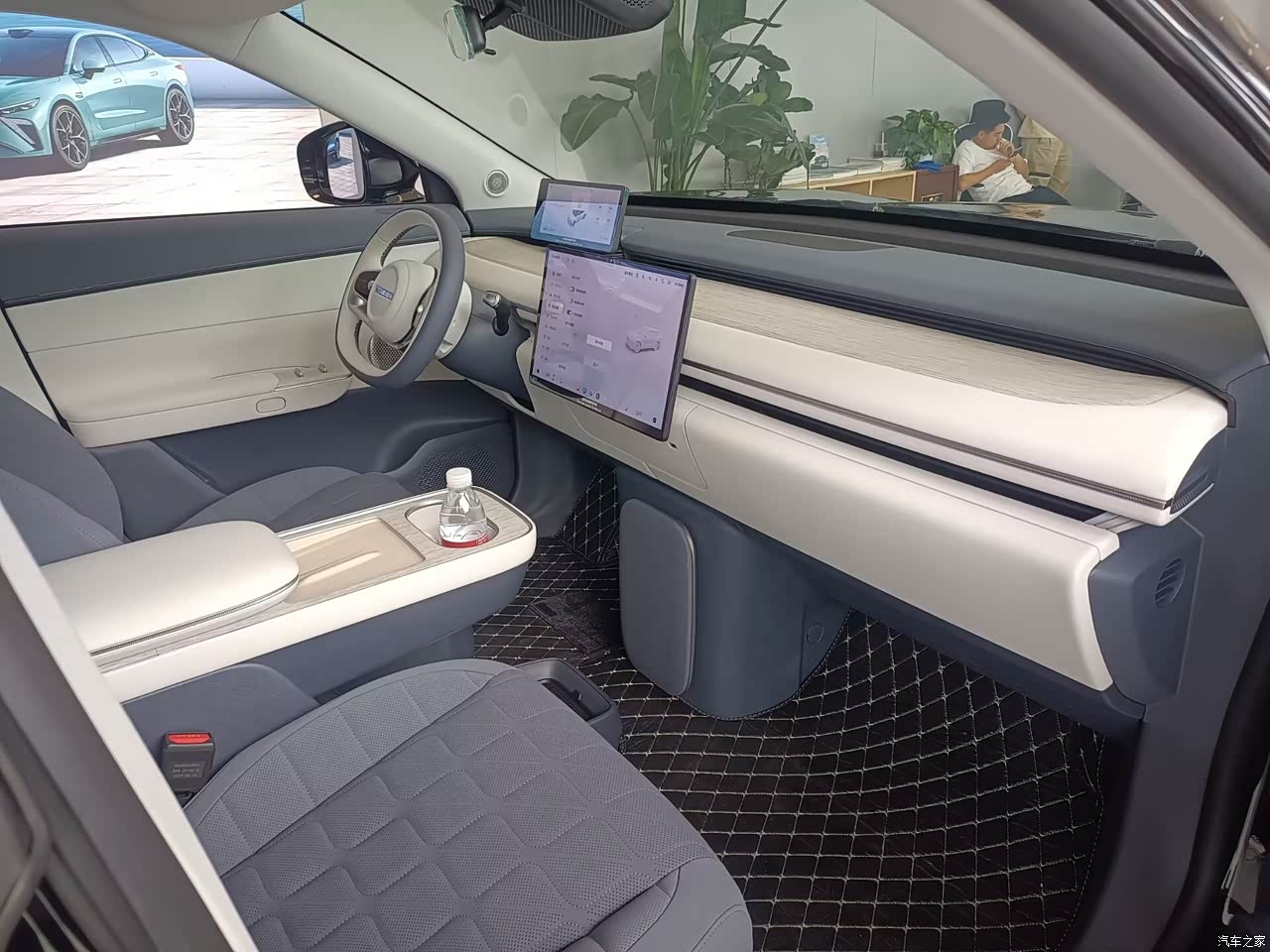 在内饰部分,星纪元ET的简洁化设计字.母的方向盘标,两块屏幕都是悬浮的,前端是10.25英寸的小仪表盘、中央是悬挂在出风装饰位置的15.6英寸中控屏,全系标配,再配上隐藏式出风口、多层中控装饰,还有悬浮下.上置物的副仪表台,视觉性与功能性都是考虑到了的。