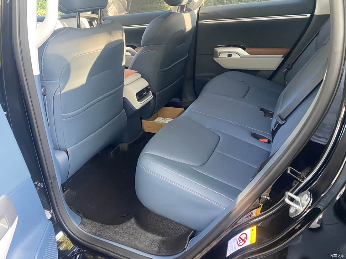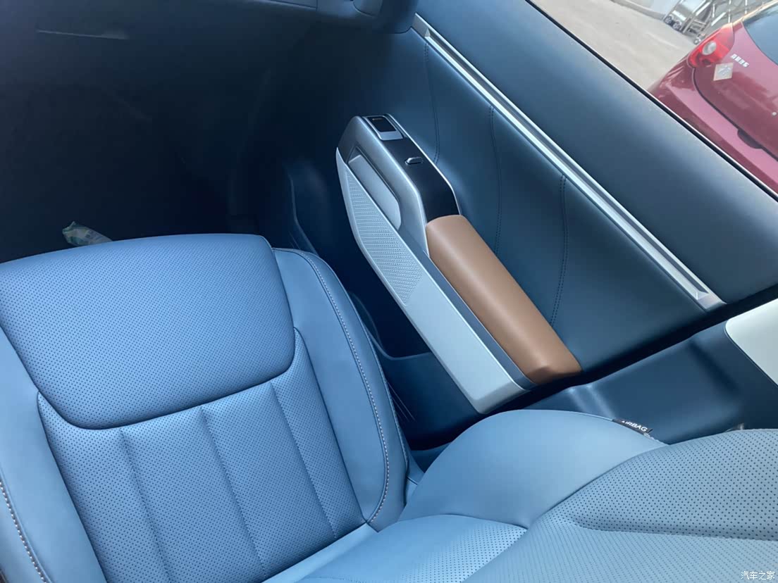 选了冰川蓝内饰,很高级也很清新,但中央扶手是白色的不耐脏;前排座椅带通风加热很舒服,座椅宽度很好,长度也可坐着很大的感觉,稍微有点偏硬;后排座椅宽度很好,三个成年人坐着也很舒适,后排有出风口但是没有调节按键,这有点配置缺失。