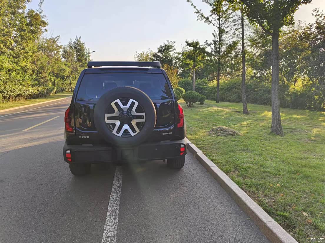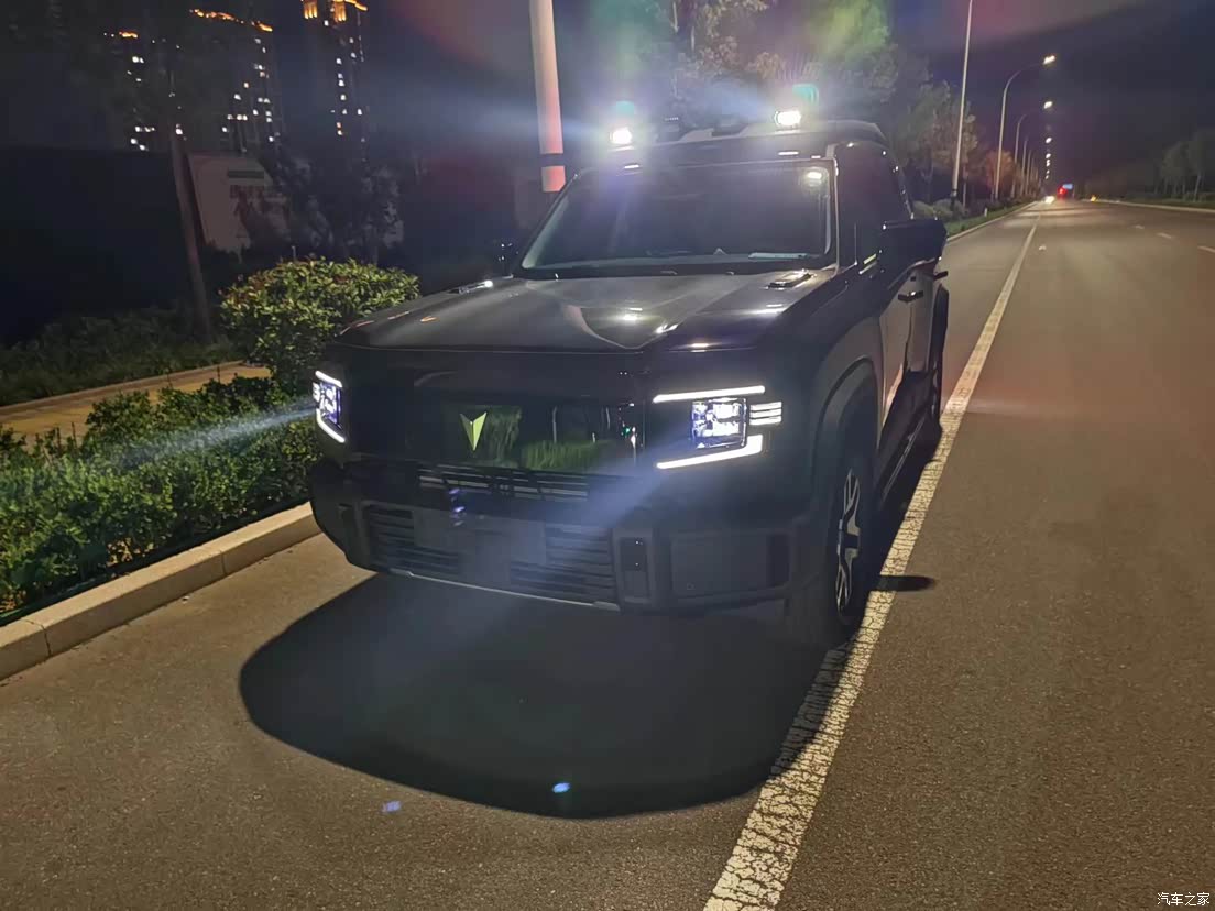 外观设计有点未来机甲风格,很科幻;车漆选的峡谷黑,稍暗环境下是黑色,但是强光和太阳底下是黑蓝色,黑漆里面有蓝色星星,闪闪发光;大灯都很亮,尤其是选了行李架plus,上面带着四个大灯,走夜路是道路上最亮的仔;腰线设计符合越野车定位;车尾带备胎很有越野风格,外观仁者见仁 智者见智,对我来说很喜欢。