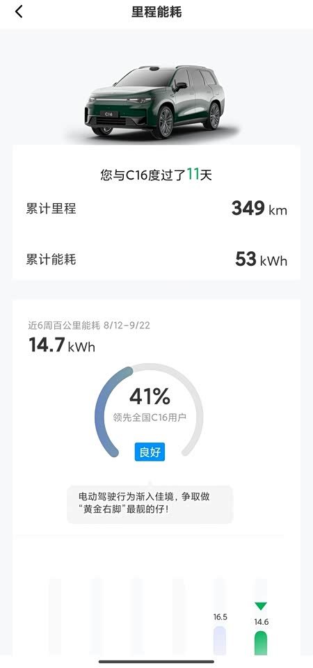 一、选购心路历程: 喜欢零跑c16已经很长时间了,在7月底果断下定,等待了40多天,终于开上了我心心念念的零跑c16。 首先,我为什么选择零跑c16这辆车?是因为家里六个人出行,这是刚需,但是市场上可供选择的六座车不是很多,挑来挑去,从mpv到SUV,能够满足我出行舒适,方便,智能化,经济的产品只有那几款。经过多轮反复比较,试驾和参数对比,零跑c16成为了最适合我的那款。于是,果断下定,终于开上了我的爱车。 C164.9米车身不太长,避免因为居住地停车狭小的问题造成停车不方便问题,当然了,有利有弊,后备箱小是个比较大的问题,车友推荐安装前备箱(我的是纯电车型),后续可以解决这个问题。 二、用车体验: C16的性价比非常高,各种智能化功能装备满满,使用过程中我对以下3点非常满意。 第一就是他的零动空间。可玩性很高,可以设置成开每个门不同的欢迎语,同时开启喜欢的音乐,智能化功能感受满满也极具个性化。 第二就是他的第二排的电视。孩子们特别喜欢电视上车就打开,老人也可以在电视上选看自己喜欢的电视剧。其实适合家人的才是最最有用的。 第三就是车子的lcc、自动泊车和遥控功能,能够很方便的解决长途高速开车疲劳、新手停车场停车和车位比较挤不好下车上车的痛点,零跑可以说把用户的困难都考虑到了并完美解决。 三、亲友评价: 老人对这个车非常满意,主要是静音程度比较高,座位比较软,老人坐着很舒服。孩子也对这车也是赞赏有加,车上的电视能让他们安静下来开启快乐旅程。 四、期望: 说实话这个价格买到这辆车还是非常合适的,感谢零跑,也很高兴加入组织,希望我们的c16能越来越好。 我希望能找到车友会组织,能够组织我们零跑车主参加一些户外活动,丰富我们的有车生活,非常高兴能够拥有零跑c16,一样和大家一起旅游和分享。