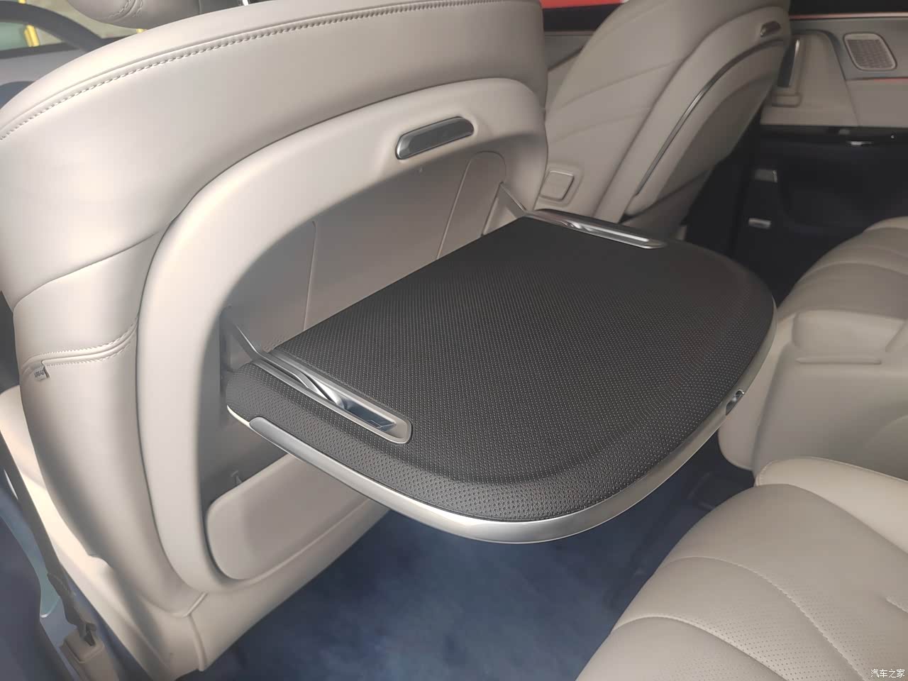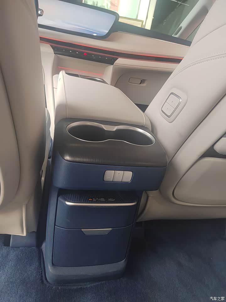 那是做工用料,完全没得说质感超级好,纳帕真皮的座椅材质坐在上面腰部支撑效果也感觉挺不错,而且它的配置也比较丰富,像中间的冷暖箱设计可以前后移动,后面的人员想要拿东西的时候,只要按一下中间的解锁,再往后滑动拿水什么的都比较方便,而且还配了有个小桌板,我们家里面有孩子,接送他上下学的时候还可以在上面吃个东西什么的,感觉挺方便的,唯一有点儿不太满意的就是内饰的颜色太浅了,这种象牙白的看起来非常上档次,是没错,但是家里面有小孩儿的车主感觉肯定会头疼,,,话说你们是怎么打理的呢?这稍微蹭上一点,感觉都非常明显,这种材质摸着都不好打理感觉,估计得从网上买那种专门皮质用的清洁剂,家中常备,要不然的话肯定特别显脏