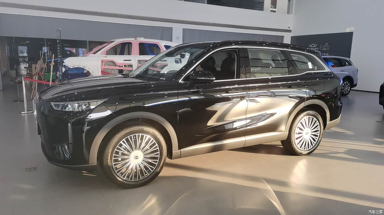 外观设计大气硬朗,车身线条流畅,融合了东方美学设计和现代科技元素。前脸采用了封闭式格栅,虽然缺乏一定的创新性和独特性,但是搭配硕大的 logo 标识,提升了品牌辨识度。车尾部分圆润饱满,贯穿式尾灯进行了熏黑处理,点亮后辨识度极高。 隐藏式车门把手不仅增加了车辆的科技感,还降低了风阻;车顶配有黑色行李架,增加了车辆的运动气息;20 英寸的大轮毂与车身搭配起来十分大气,让整车看上去更具力量感。
