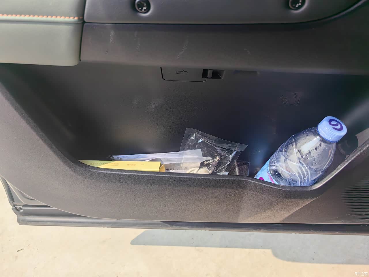 中控空间也不错,尤其屏幕边那个凹槽,放眼镜盒正好啊。门边的储物空间也足够使用,中控扶手位置前面可以放手机进行无线充电,下面那个位置放餐巾纸,抹布都可以,不用擦车布放前挡那里了。两个把手的造型也不错,跟保时捷卡宴一样。就是后备箱稍微小了点。一个周转箱一放,就不够用了。但是如果车内二排不坐人,可以把二排放平,那放的东西还是可以的。出行可以放个气垫床,直接睡车里,开个露营模式就可以了。顶上装了行李架,又可以增加露营装备绑上面,所有总体空间还是够用了。