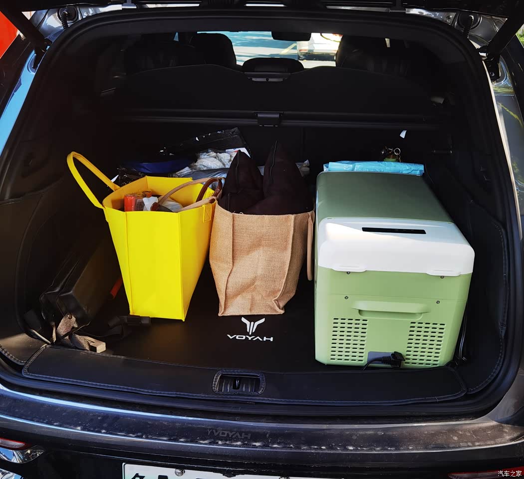 我们全家个字都比较高,男主人1.86,两个儿子也在持续长个,free318不愧他中大型suv的身份,男主人坐在前排调整到合适位置,再坐到后排仍然有膝盖前1-2拳的空间,同时头部空间也非常宽敞。 后备箱空间也比较大,后面也有一个点烟器口,可以安装个冰箱,我装了一个20升的冰箱,可以装20瓶550ml矿泉水。