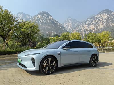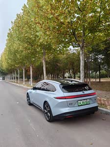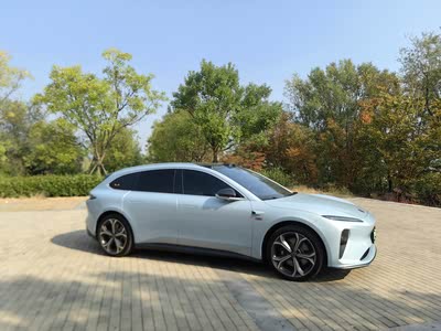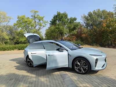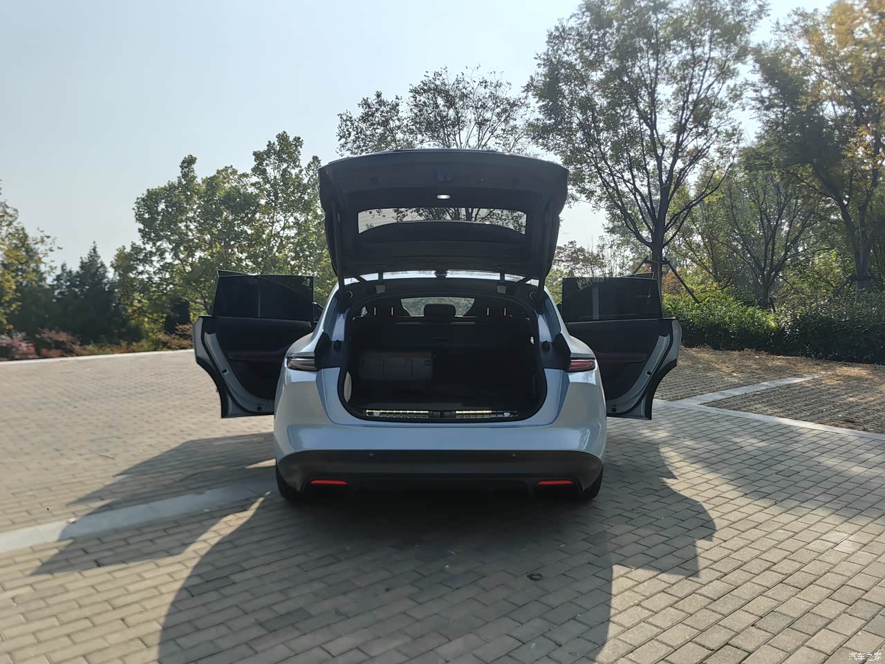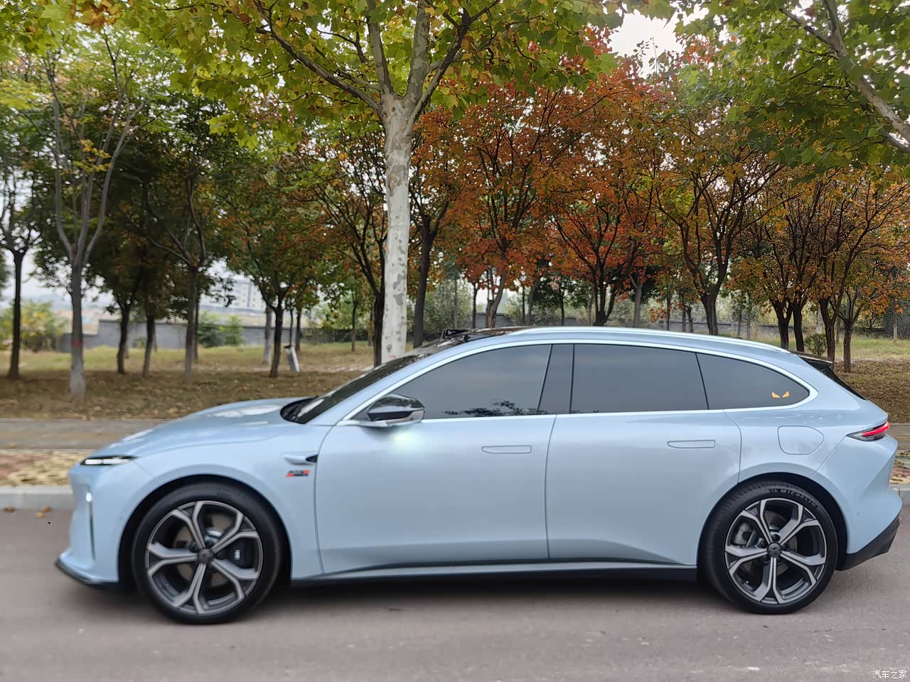 飘逸灵动的侧面线条,如果说前脸的设计是延续蔚来家族语言,那么尾部的设计我认为十分惊艳了,贯穿式的尾灯不夸张极具辨识度,顶部尾翼贴了个天窗膜与天幕融为一体,底部双色设计的扩散器又与侧裙与前铲贯穿。选装了行李架导轨,还是为了外观。
