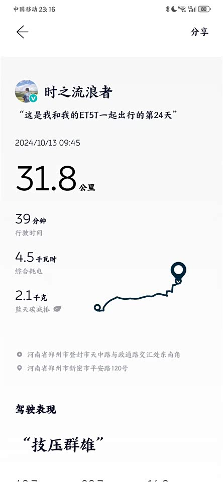 我这里是河南一个县级市,市区半径三公里左右,属于小街道多,红绿灯多,道路参与者复杂的用车场景,走走停停是常态,我每日通勤是从市区最西边到东边20公里的镇上工作,目前这20多天的用车环境也相对固定,不用开空调,车速也是50-80居多,续航也没有很仔细的算过,剩余百分之三十也有时间就充电了,目前这个季节我觉得我的驾驶习惯及场景跑接近400问题不大。毕竟是双电机四驱,属于中规中距可接受范围内。
