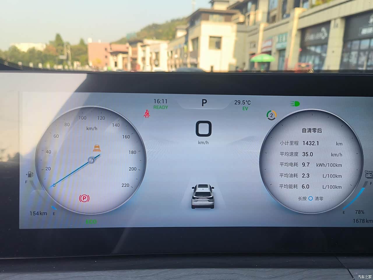 出发前:加油 220 元31.94L,油箱油量 45.8L,表显续航 751km,纯电续航 73km。里程 97*2=194km,其中高速路段 170km 左右,乡道和国道25km 左右!到家后:油箱油量 37.4L、表显续航 616km、 纯电续航 23km。 ➡️计算油耗 油箱:45.8-37.4=8.4L, 表显续航 :751-616=135km 纯电续航 :73-23=50km 综合计算: 135+50=185km!!(表显消耗里程) 实际路程 :194-185=9km,这 9 公里误差可能是在路程中发电机充电了 9km 里程! 双电机的好处就是一个用于驱动一个用于发电,既要又要还要的好处! 最后算出百公里油耗 4.2l/100km! 从这次油耗里程和计算得出,这次出行的油耗我还是非常满意!