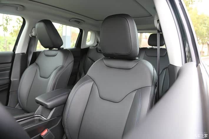 纯皮座椅,软性材料装潢,没有一点廉价感,对于这个价位的车来说,挺不错了。 座椅是纯皮质的,我的内饰座椅都是黑色,整体比较好看,配上品牌logo,更是棒极了。 但是座椅的皮质用料感觉有点硬,坐上去没有织物座椅那么柔软舒服,也算是有一利有一害、有一长有一短吧,就要看自己需要什么去取舍了,不能苛求。 内饰的其他部分都是软包材料,摸上去手感不错,一看就很精致,并没感到人家说的美系车粗犷粗糙,反而感觉做工都挺不错。 方向盘也都包了皮质手缝的材料,手握上去非常厚重踏实。