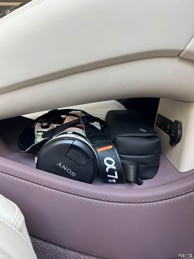 车内储物的地方还挺多。四个车门都有储物格,可以放一些饮料、随车用品。 前后双冰箱,这两个地方是充分利用了空间,平时不开冰箱的话可以存放许多东西,但是要记得别开冷藏或者加热,把冰箱关闭即可,不然容易起霜会潮湿。 中控底下有一个储物空间,但是比较小,女司机可以放一双鞋子,比如高跟鞋等等。平时也可以在这里放行驶证、墨镜盒、纸巾盒等,毕竟其他也没有合适的地方放这些东西。 副驾驶的手套箱挺大的,可以放一个麦克风,平时唱唱歌正好,原车也配备了麦克风充电口,插着存放就会自动充电,很贴心的设计。