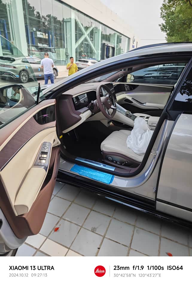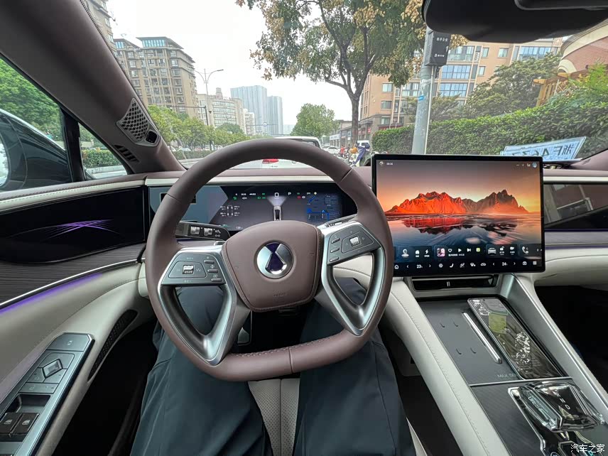 内饰非常满意,整车皮质非常柔软,所有可见的地方都是nappa材质包裹,用料完全是高端豪华车的品质,这方面腾势绝对是下了大成本的。 车顶是绒面材质的,触感和手感非常好。 车子用了很多金属亮面材质,没有用廉价的钢琴烤漆面板,好评。 车子的仪表盘和副驾屏幕是对称的,都是隐藏式的边框,看起来有点无边框。中控屏幕巨大,边框很窄,分辨率很高,看起来很高级。 车内的水晶档把和帝瓦雷升降音响,都是水晶材质,夜晚在氛围灯的衬托下,看起来非常漂亮。