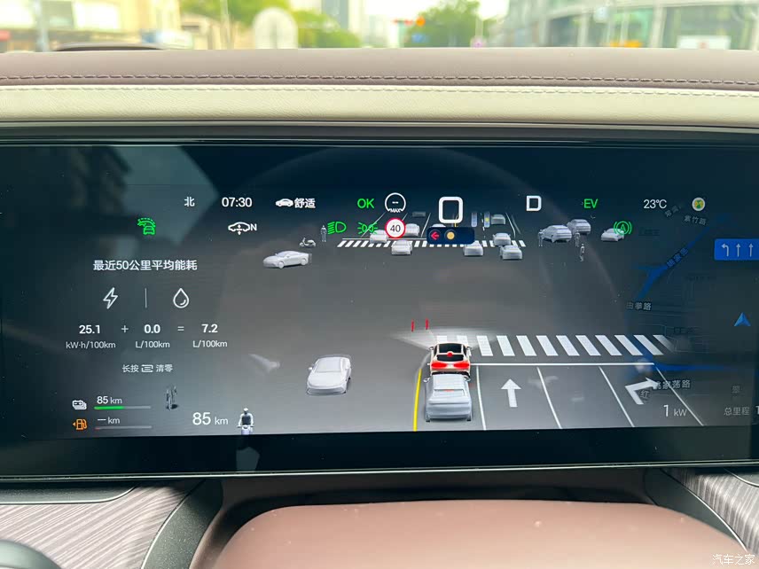 平时跑高速动力储备完全足够,只要开舒适模式就够用了,超车非常轻松,轻轻一脚就能加速到120甚至更快。 而且电量低的时候,开HEV强制保电状态下,发动机声音较小,但是加速动力依然超强,给驾驶员的超车信心非常足,很有安全感。