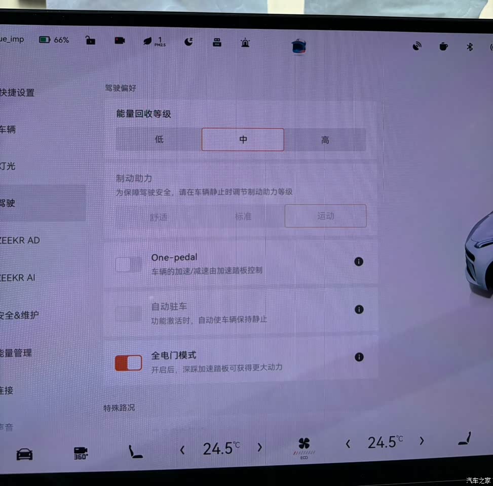 在智能化方面,极氪001基本上硬件上都有,但在软件方面很多地方做的还有所欠缺。首先是车机方面,虽然采用了高通8295芯片,但是在第一次操作屏幕时,会出现卡顿情况,点不动,拖不动,奇怪的是,只要经过了这次卡顿,之后的操作就会变得十分流畅,不会出现卡顿情况,直到下一次重启车机。在语音交互上,eva的识别还是很准确的,常用的操作不在话下,但如果你要说些无关车机指令的话,eva就可能不理你了。2025款极氪001的全景影像进行了升级,变得更加清晰了,自动泊车也挺好用的。