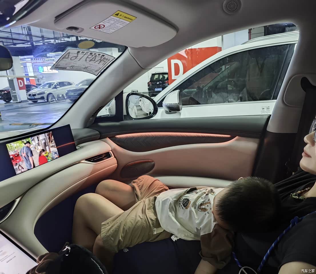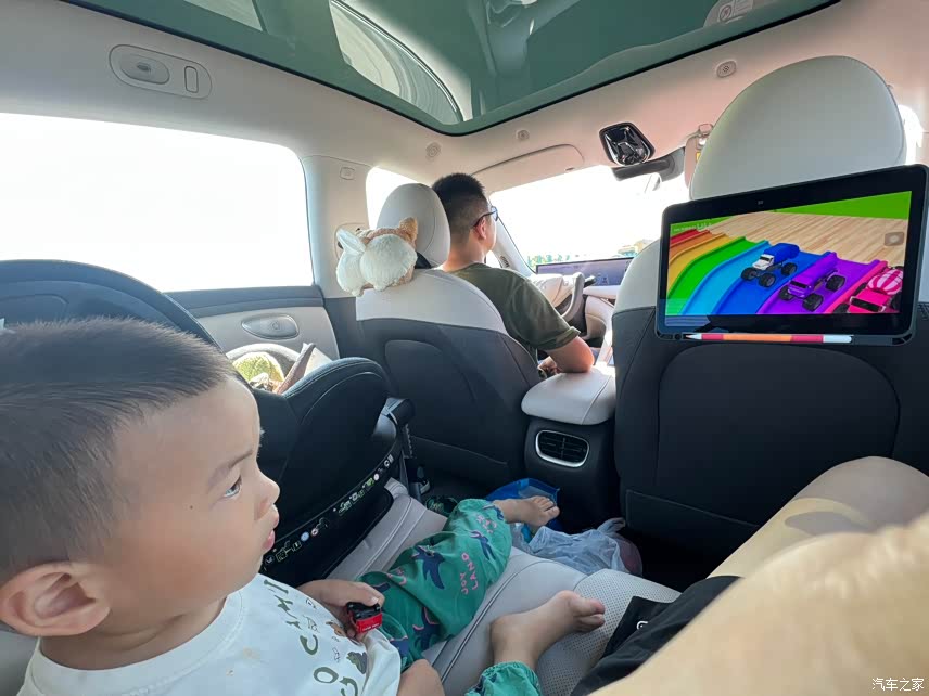 第一次尝试浅色内饰目前感觉比较好打理,宝宝湿巾一擦就干净了,座椅软硬适中,比之前拉拉的毛坯舒服太多了,美中不足,就是座椅按摩太微弱了...木纹板加上氛围灯晚上行车心情很好;主驾大屏、副驾屏、后面我自己磁吸了一个ipad,长途行车安抚好大儿的利器;休息的时候队友可以安心看球,我可以刷剧