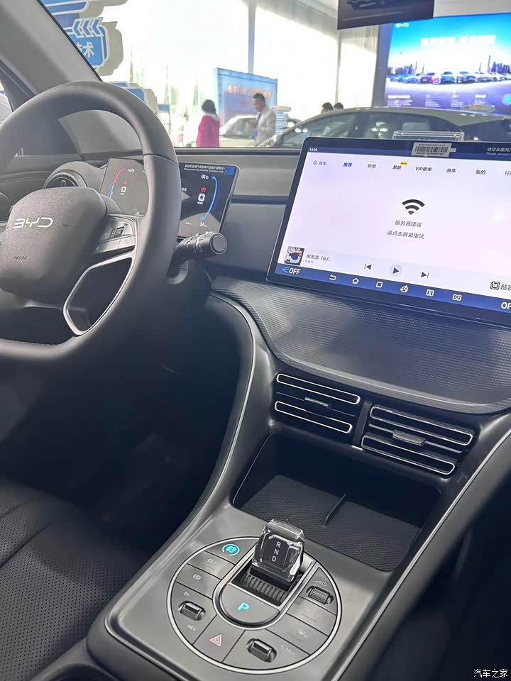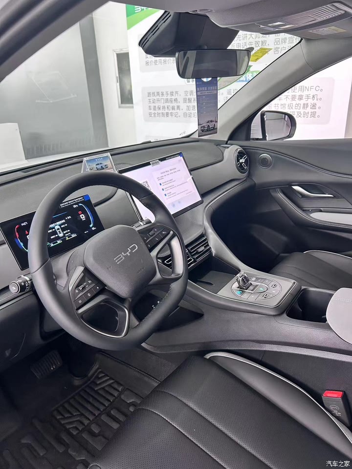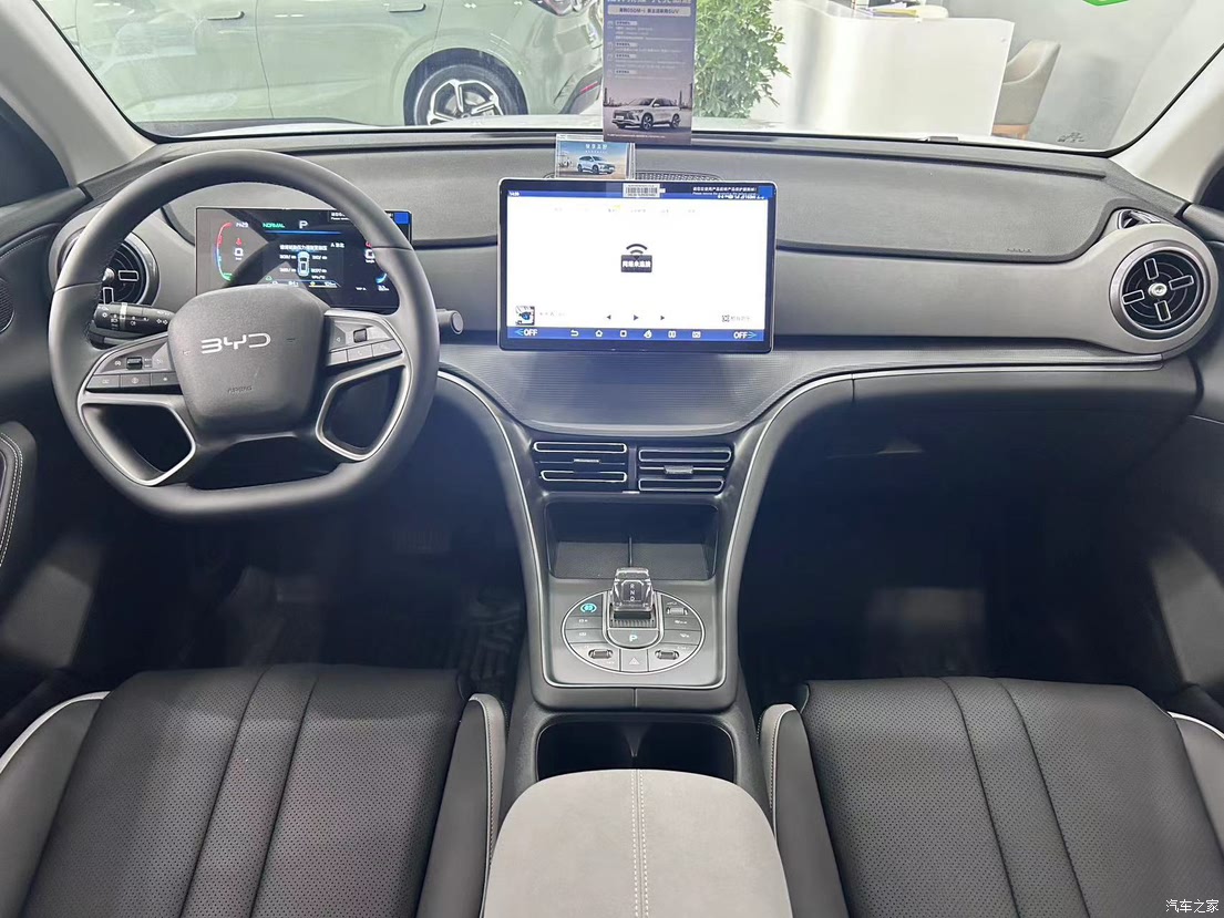 中控台配备全液晶仪表盘和大尺寸显示屏,低配12.8英寸,高配15.6英寸,搭载比亚迪DiLink智能网联系统。采用平底四辐方向盘,换挡区域为圆形设计,水晶挡杆精致;挡杆周围有一圈常用的物理按键,包括启动按键、电动/混动切换、电子手刹、音量调节等。前排座椅采用一体式头枕设计,这种设计不仅在外观上看起来时尚、运动,而且能够为驾乘人员的头部提供良好的支撑,减少长时间驾驶或乘坐时的颈部疲劳。