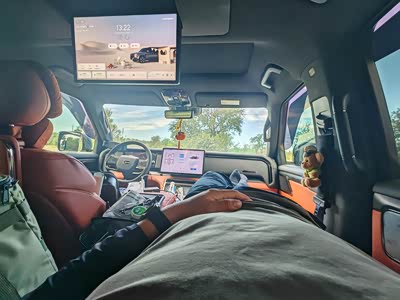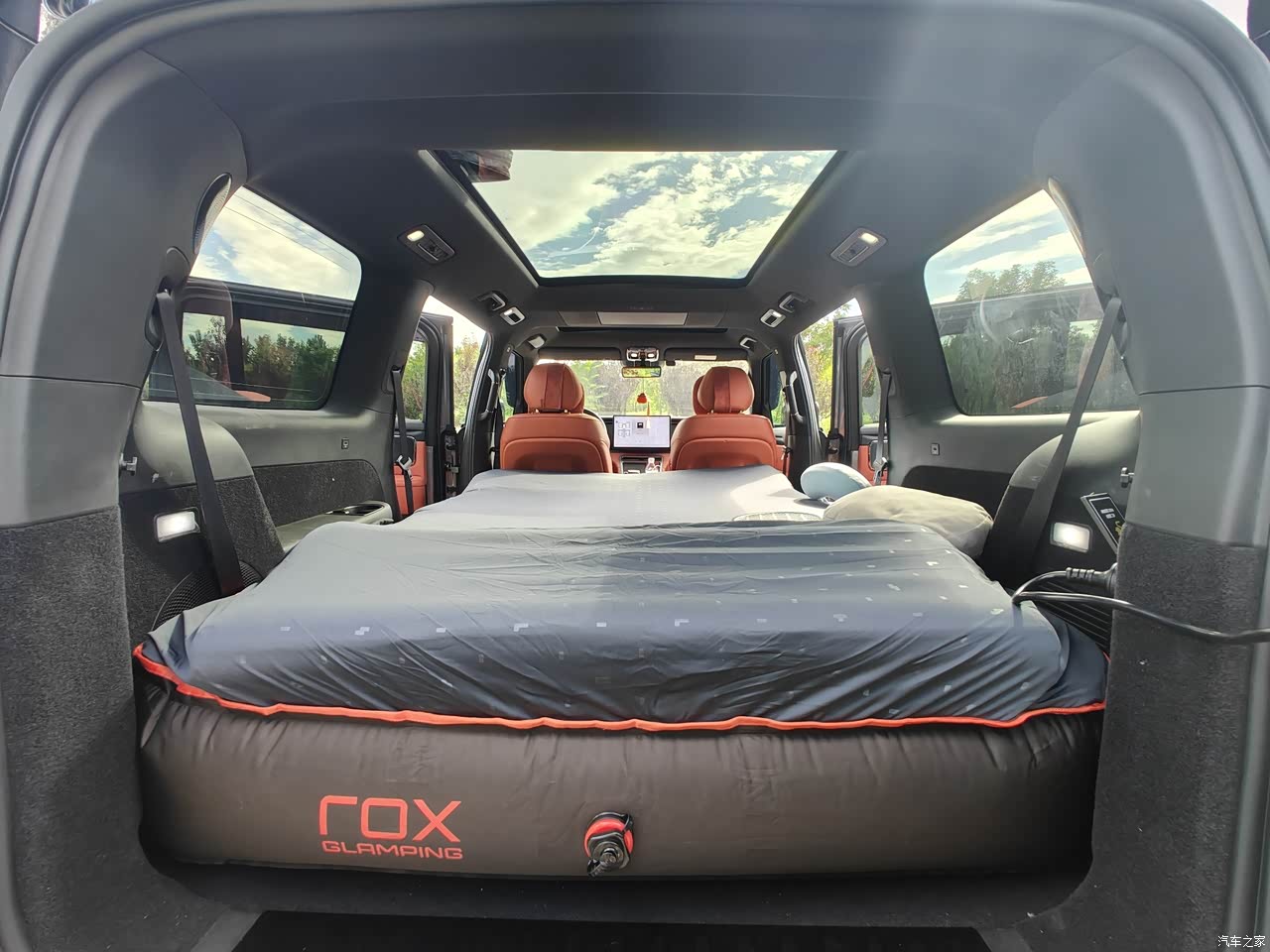 极石户外场景露营功能非常好,二三排放倒,配上极石官方1970*1295*235MM充气床垫,轻松容纳一家三口户外露营,我178身高盘腿坐在床垫上还可以打牌,基本是直着腰的,这个高度一般的7座suv的车都达不到,近日极石又推出的单人床,中午午休的好地方,极石露营模式,后排娱乐屏控制锁车,空调,遮阳帘等,打开睡眠模式自动关闭遮阳帘,锁车,打开空调,设定闹钟提醒,把车开放空旷的草地,铺上单人床,给下午充满电。