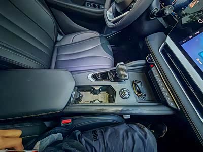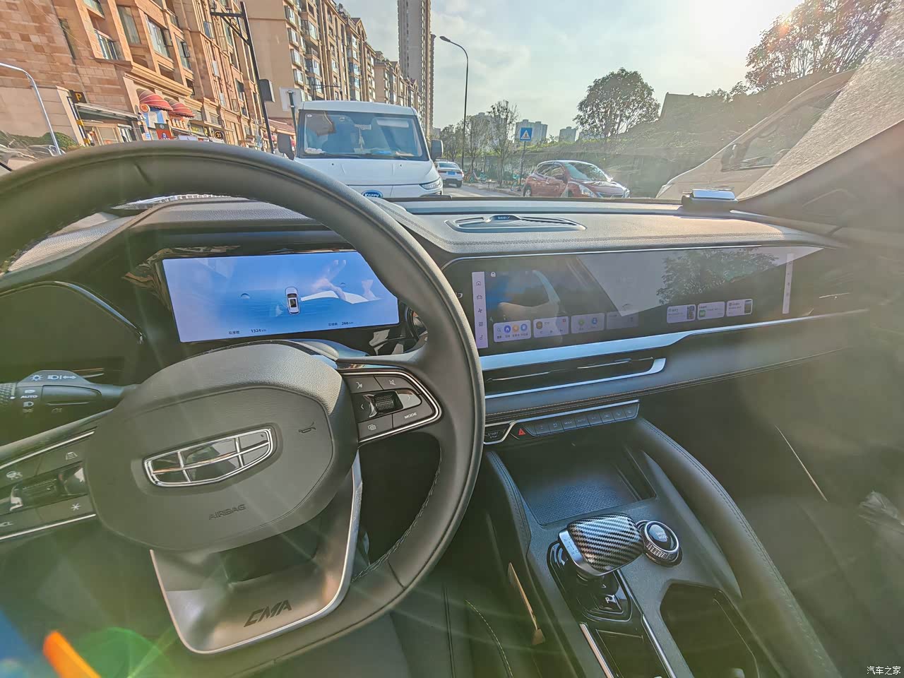 内饰我是挺喜欢的,颜色耐脏,遮阳板可以挡前面阳台也可以挡侧窗玻璃的阳光,还有很多方面的细节都很不错,这里就不一一说了。中控的话,我是自己贴了一个贴纸,然后挡把贴了一个这种碳纤维纹理的挡把,屏幕贴了一个钢化膜,因为感觉中控上面不贴一个这个东西太容易粘指纹了,就特别难清理。