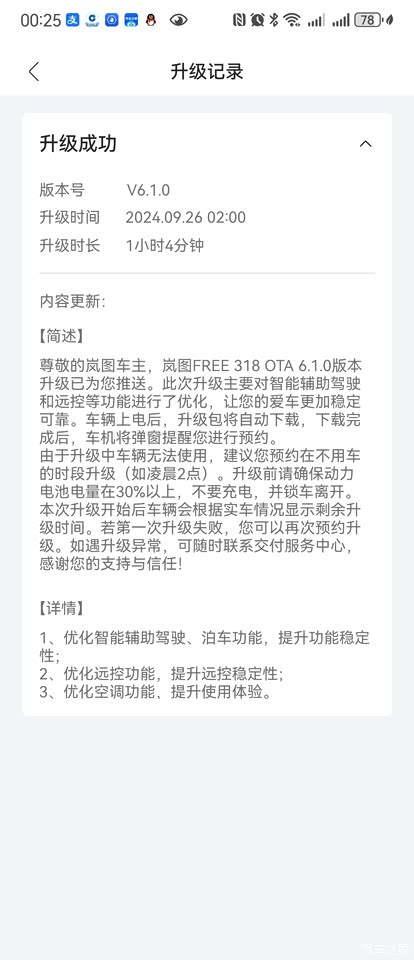 最新版本号V6.1.0,9.26日凌晨自动完成更新。优化了智能驾驶、远程、空调等功能。
