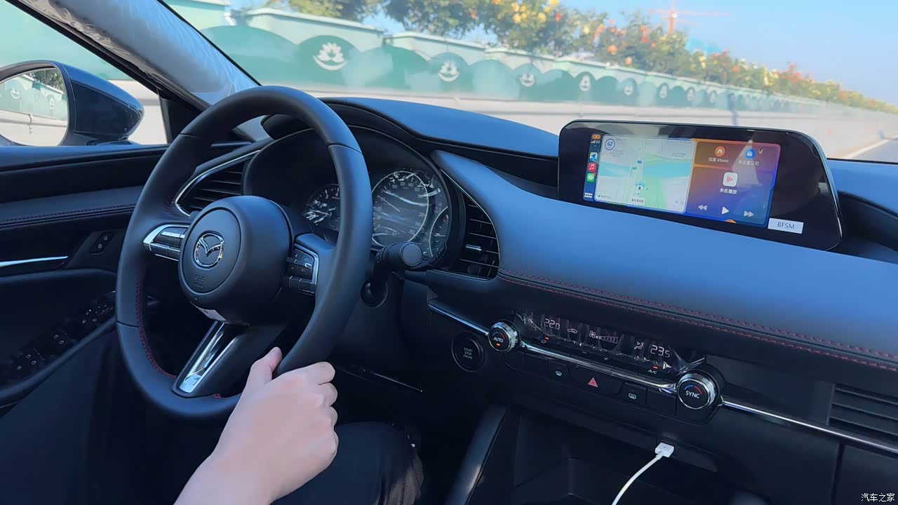 昂克赛拉的车载屏幕不是很大,但画质清晰,倒车影像分辨率也高。总体内饰简约而不简单,全车能摸到的地方基本都是真皮和软包,实用的物理按键和旋钮的结合,能够给出精确的反馈,在驾驶过程中也可以实现盲操。