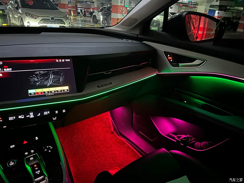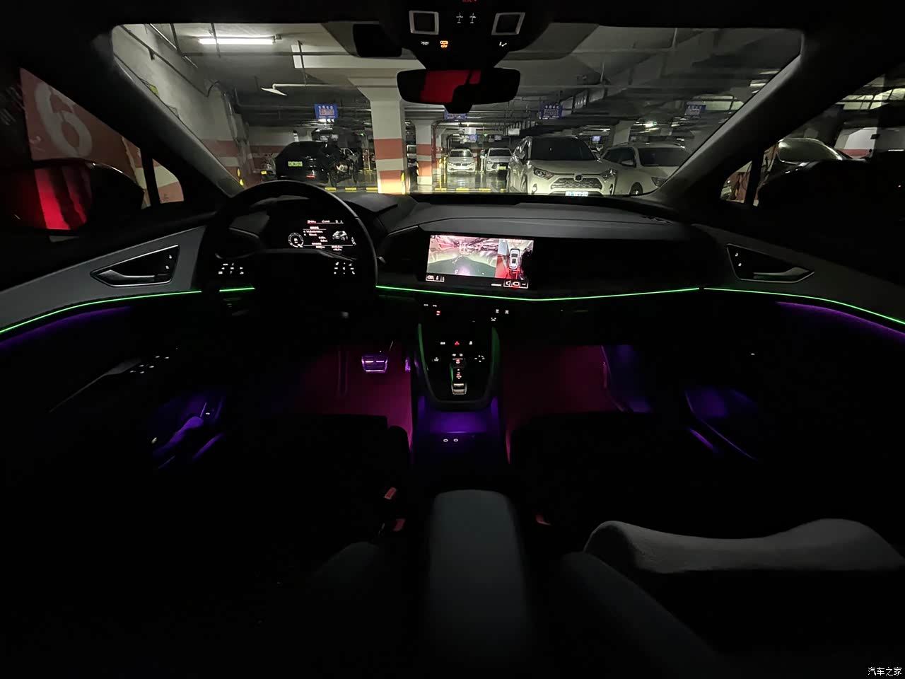 我这个内饰估计是全网独一无二了,自己加装的氛围灯,回来才发现师傅把线接错了,去调整了一次,把前面两扇门上的灯接好了,后门当时来不及,只好哪天再过去调整。车内隔音很好,提车后大概3天以后车里基本没什么味道了。车辆的做工可以侧面来说明一下,安装360的时候,师傅把车门拆下来后,原话是,卧槽车门这么重。当时旁边有一辆丰田也在装360,听到俩安装师傅对话,说这一个车门比那辆车三个都重。其实我当时选q5e还有一个理由,我认为作为传统油车里最成功的豪华品牌之一,同样竞争定位的车,他肯定有可取之处,尤其是在看不到的地方,毕竟多年成功经验的积累。