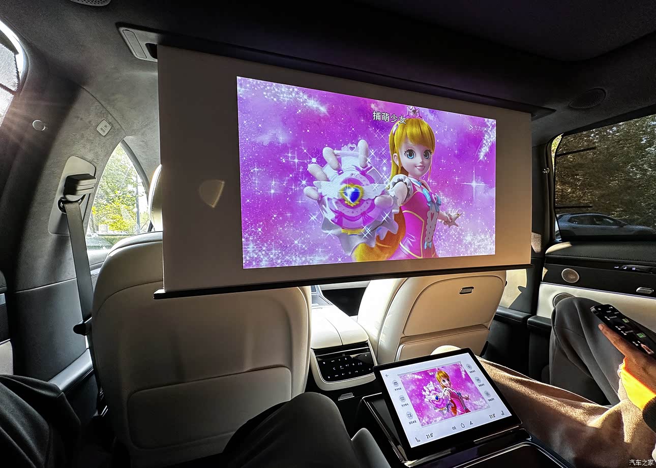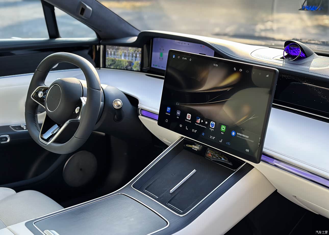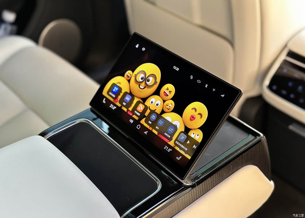 内饰设计属于简约但不简单那种类型,触手可及之处基本全是真皮包裹,手感非常的柔顺舒适,全车遮阳帘拉满了,搭配巨幕投影,带来全方位的隐私空间。车内的空气也非常的清新,没有异味,了解了下是采用了中科院专利吸附降解材料、自动新风系统等,坐进车里就像去了深林氧吧。车内功能都集成在中控屏里,15.6英寸的悬浮式大屏内置的HarmonyOS 4操作系统用起来很丝滑,跟在家用平板电脑没啥区别。