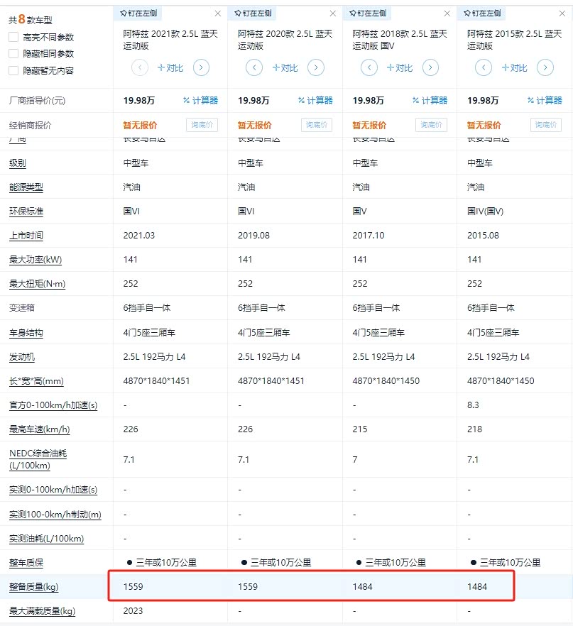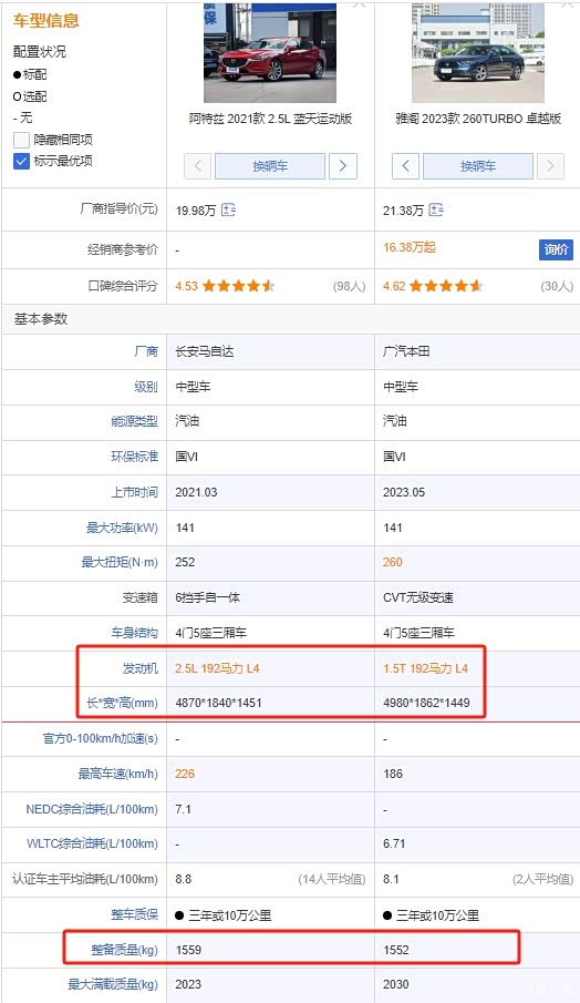 21款阿特兹2.5运动与十一代雅阁卓越部分参数对比,车重、马力、扭矩相差不大,油耗也有参考性