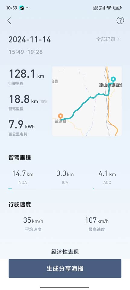 凉山这边天气暖和,不管冬天夏天,所以全部按春秋算,城市700左右,高速600左右。感觉不真实的可以搜下二个城市的海拔,然后自己算一下。城里不急的话13左右电耗,高速100,15左右,110.16.5左右。120.18-19。感觉还不错。