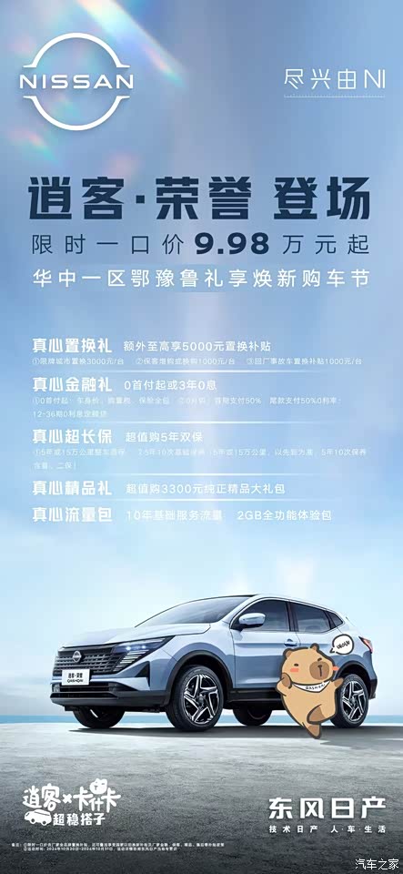 1. 真心置换礼:额外至高享5000元置换补贴,包括限牌城市置换3000元/台、保客增购或换购1000元/台、回厂事故车置换补贴1000元/台。 2. 真心金融礼:提供0首付起、0月供、0利率的金融方案,具体额度详询专营店, 3. 真心超长保:超值购5年双保,含5年或15万公里整车质保、5年10次基础保养。 4. 真心精品礼:超值购3300元纯正精品大礼包,包含多种原厂精品配件。 5. 真心流量无忧:实名认证后赠送日产智联10年基础服务流量,新车实名认证后立享2GB流量的全功能体验包。 6. 限时一口价:逍客·荣誉版限时一口价分别为9.98万元和10.88万元,相比官方指导价有较大幅度的优惠。