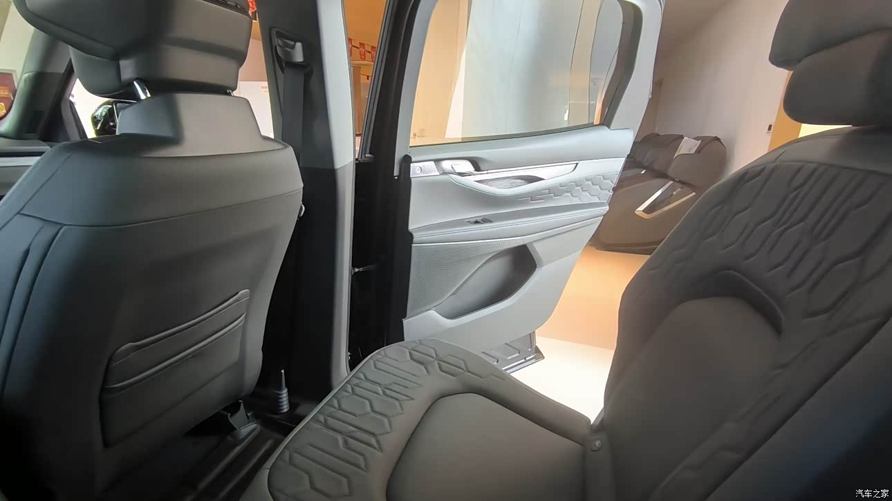 内饰用料不算奢华,但质感确实不错,真皮座椅坐起来蛮舒服,中控台的一些细节处理挺扎实,不会让人觉得廉价,基本都是皮料包裹的手感很好,坐进去特别舒服,靠背对腰身的支撑很到位。中间大尺寸中控大屏,除了主界面第二个图标可以展开二级菜单,像快捷控制、车辆设置、车辆状况、系统设置这些都在里面,使用逻辑很清晰,反正屏幕上所见即所得,没有什么上手难度,第二排座椅可以进行大幅度的调节,在人少的时候第三排没有人坐,此时第二排这两个座位空间可以调到最大,几乎就是飞机上的头等舱待遇了。