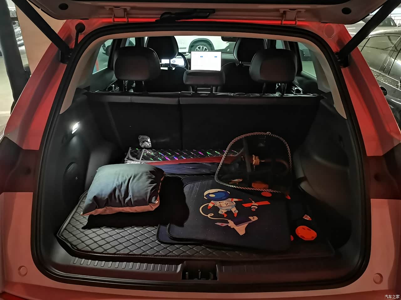 后备箱形状比较规整,日常使用绝对服务了。照片里后备箱放的是4S店送的脚垫,第一时间买了固特异的飞足丝圈换上了。