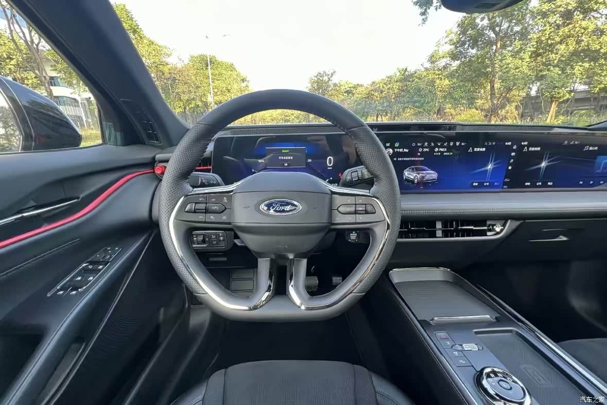 前脸采用了福特家族式的设计语言,整体造型动感且富有张力。配备了熏黑处理的蜂窝状进气格栅,不仅提升了车辆的运动氛围,还增强了前脸的视觉冲击力。前保险杠两侧配备了造型独特的雾灯,不仅提升了车辆的实用性,还进一步增强了前脸的运动感。车身侧面线条流畅且富有力量感,从前翼子板一直延伸至尾灯,营造出一种向前俯冲的视觉效果。腰线采用了分段式设计,与车门下方的凹陷线条相呼应,共同勾勒出车身的层次感。车尾整体造型饱满且富有层次感,尾灯组采用了贯穿式设计,提升了车辆的辨识度和科技感。车尾底部配备了双边共两出的排气布局,不仅提升了车辆的运动氛围,还增强了车辆的声浪效果。车窗边框采用了黑色设计,与车身颜色形成了鲜明的对比,进一步提升了车辆的时尚感。外观设计上展现了独特的魅力,既保留了福特家族式的设计语言,又融入了时尚、运动与科技元素。其动感的前脸、流畅的车身线条、饱满的车尾以及丰富的细节设计,共同构成了一款令人瞩目的车型。