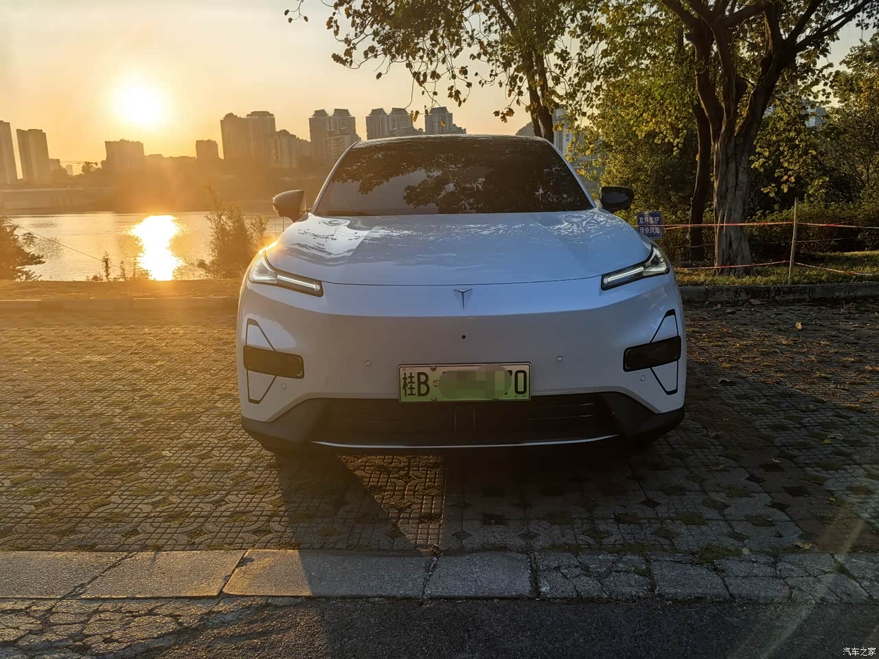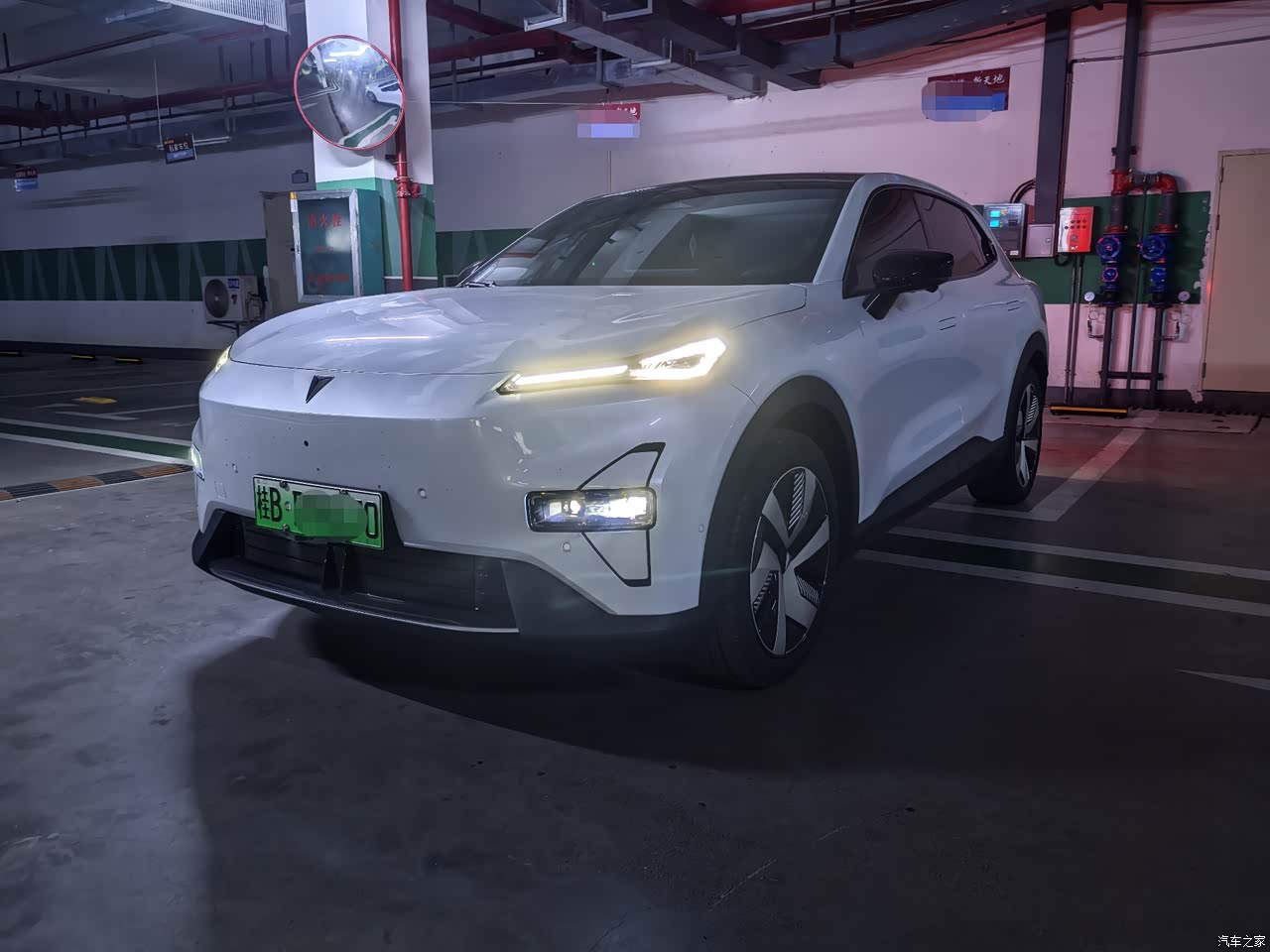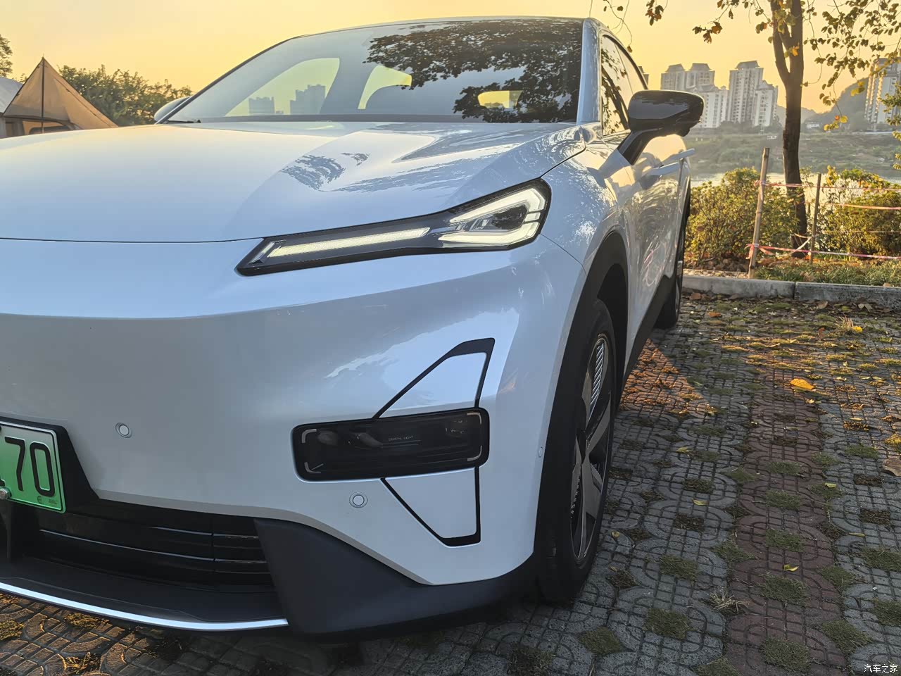 车头前引擎盖的线条明朗,给人一种运动的力量感,车牌下方是进气格栅,在打开空调之后会主动打开,进行散热,车头灯组为分体式大灯,上方为日间行车灯,下方为大灯组,跑过夜晚的高速,大灯的亮度及照射范围完全能满足使用。