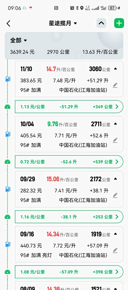油耗对我来说就不太友好了 因为我的实际用车环境基本上都是纯市区 3km 3个红绿灯的路况 平均油耗去到了14左右 不过也可以理解 毕竟那么大的车 加上2.0t动力 之前手动1.5l 也要去到10个 高速以及国道油耗就很满意了 基本上可以保持在7-8左右 空调 五个人乘坐的情况 所以这款车型还是较为适合跑长途的人入手 不过 喜欢热爱就给我冲冲冲 9.76升就是去阳江海陵岛 高速+市区综合