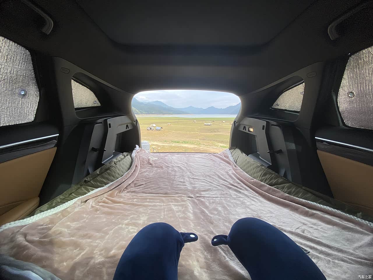 空间确实挺大的,前排驾驶位就不用说了,后排座椅放平以后联通后备箱,完全可以躺下两个人,平时车身小憩一下,或者出去露营都是不错的体验。 因为银河L7 车身尺寸为4700mmx1905mmx1685mm,轴距达到2785mm,所以较长的轴距为后排提供了较为充裕的腿部空间,我个人前排驾驶座调整至舒适位置后,后排还能有较大的腿部空间。