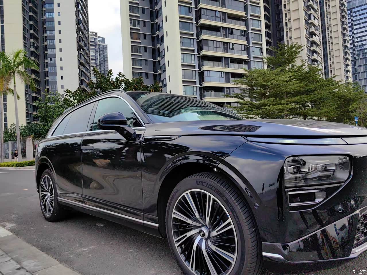 外观稳重大气,金属漆的质感十分高档,整体造型上不像一般电动汽车那么激进,更像是一款高档油车,配上21寸多幅轮毂,超级好看、耐看。