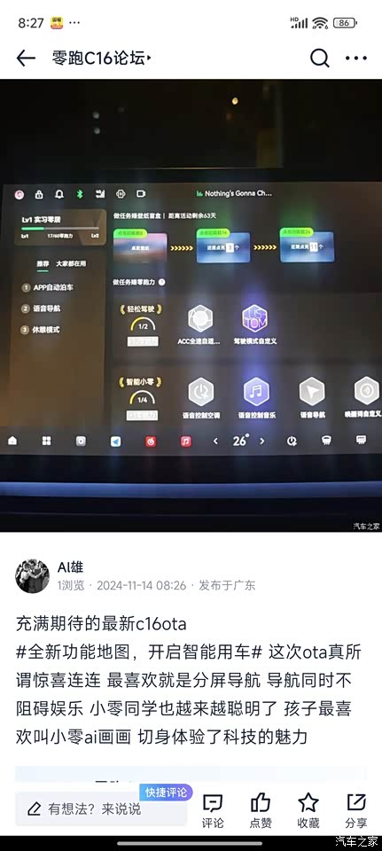 车子大大超乎预期 国庆订车 十一月提车 煎熬等了一个月 但无论外观 内饰 底盘 都很满意 800v高压充电 20min不到充到百分之80 8295智能芯片 对车机而言 简直打了一支强心针 零跑服务也到位 而且终身质保 还有啥顾虑