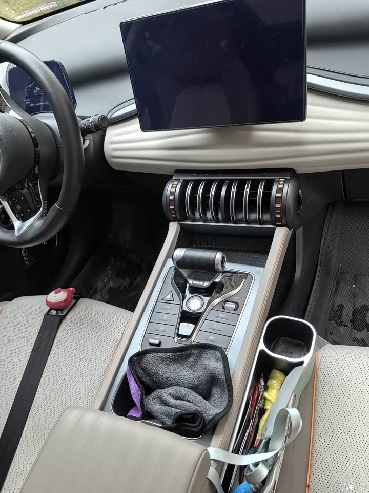 内饰简洁明了,按键全中文很人性化,就是空调口太容易藏灰尘了。旋转的大屏幕,律动式的氛围灯,听着音乐也是一种享受啊。