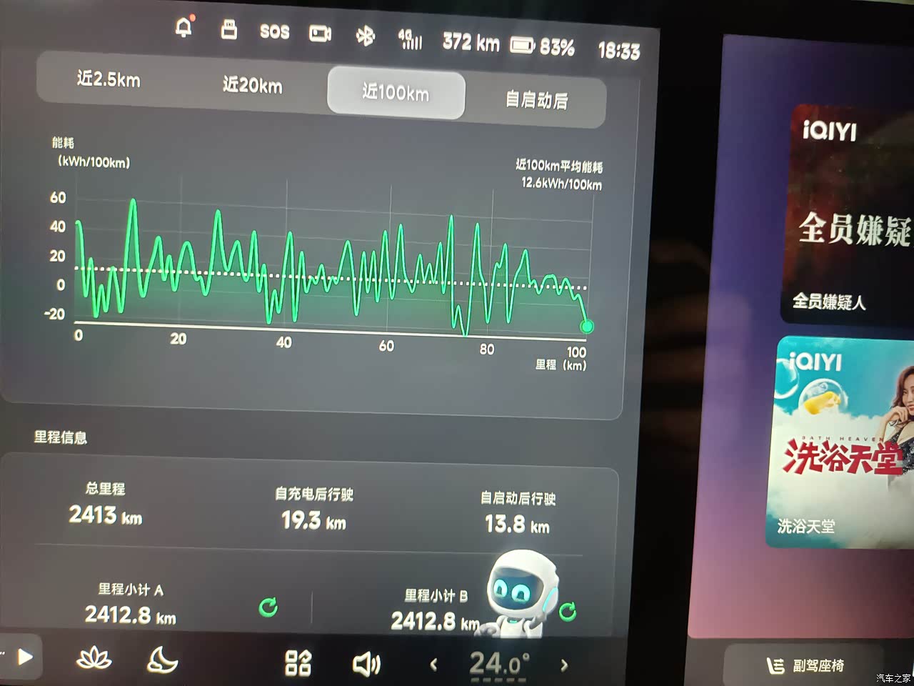 三种驾驶模式可随时切换,开了运动模式不想开标准模式,开了标准模式不想开舒适模式,安全起见还是标准模式,动能回收不能调得太高,否则顿挫感有点强。极客模式即自定义模式还没试过。