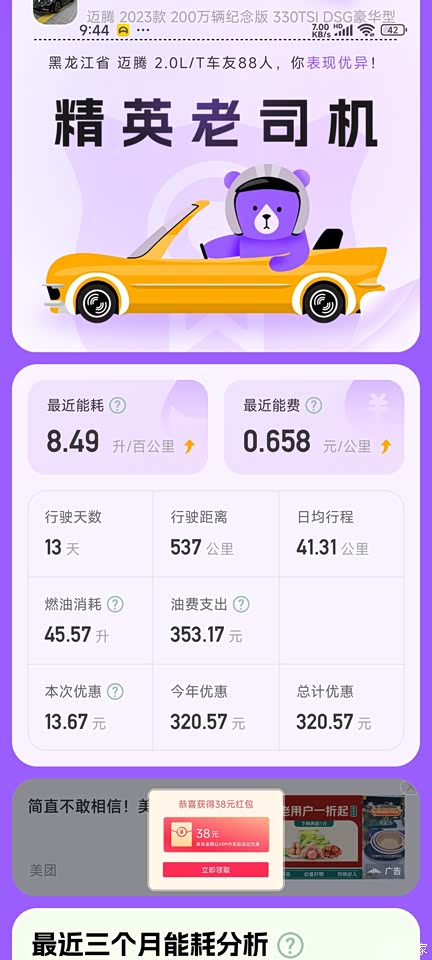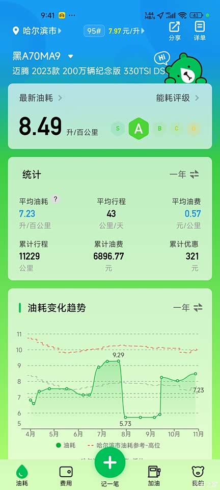 由于我高速和环路比较多,当然也有一部分市区拥堵,所以是图中这个油耗,双离合肯定没有CVT省油,但是肯定比同级别AT要省油,CVT不能承受瞬间大扭矩的爆发,但是双离合可以,所以大众的双离合算是在驾驶乐趣和油耗之间的一个平衡吧。总的来说这个油耗在同级别B级车里算比较低的了。