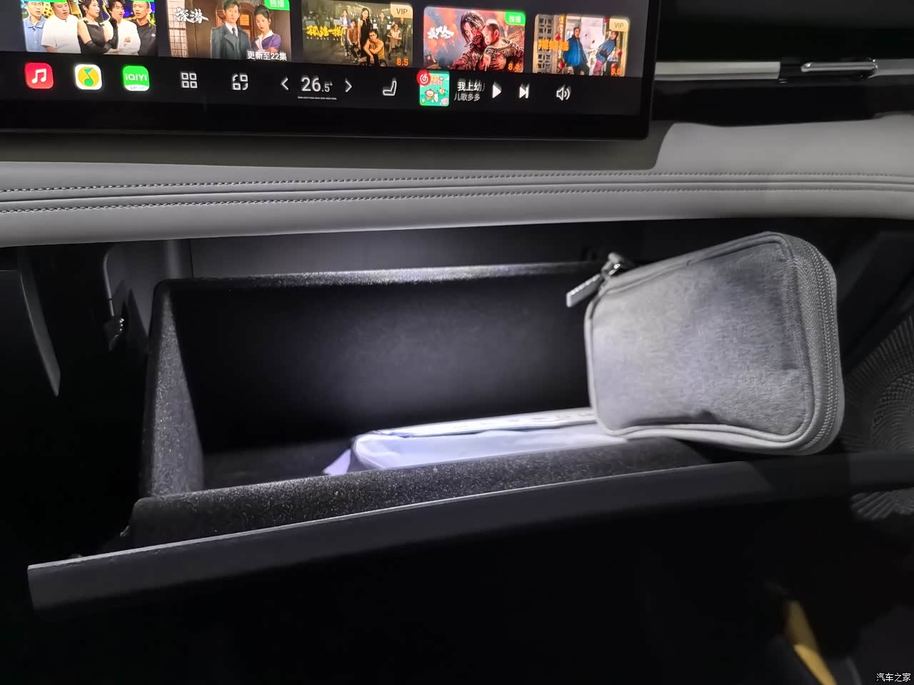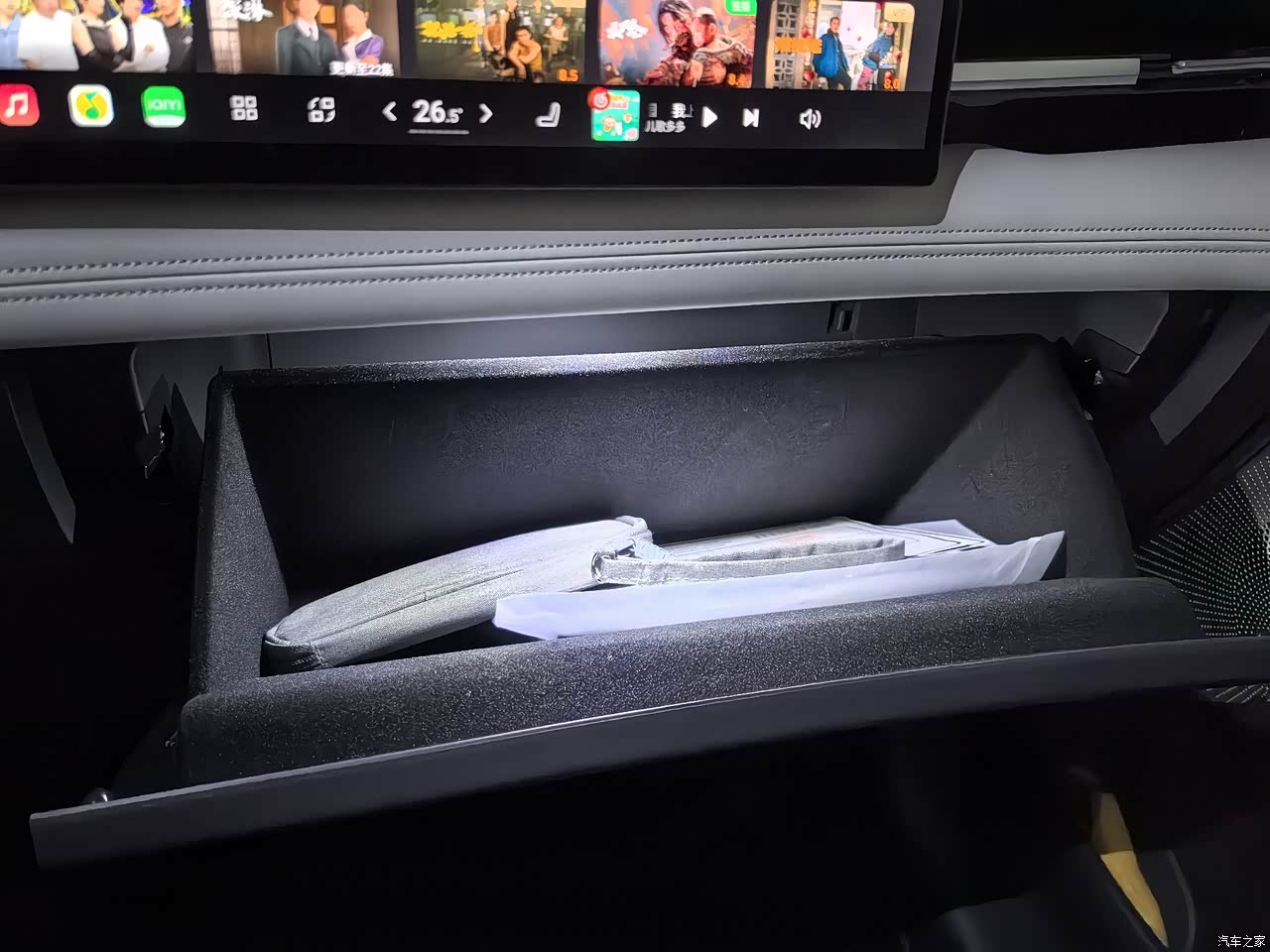 音箱口、空调出风口这些塑料感比较明显。副驾驶的储物柜太小太鸡肋,只能放些使用手册之类的。