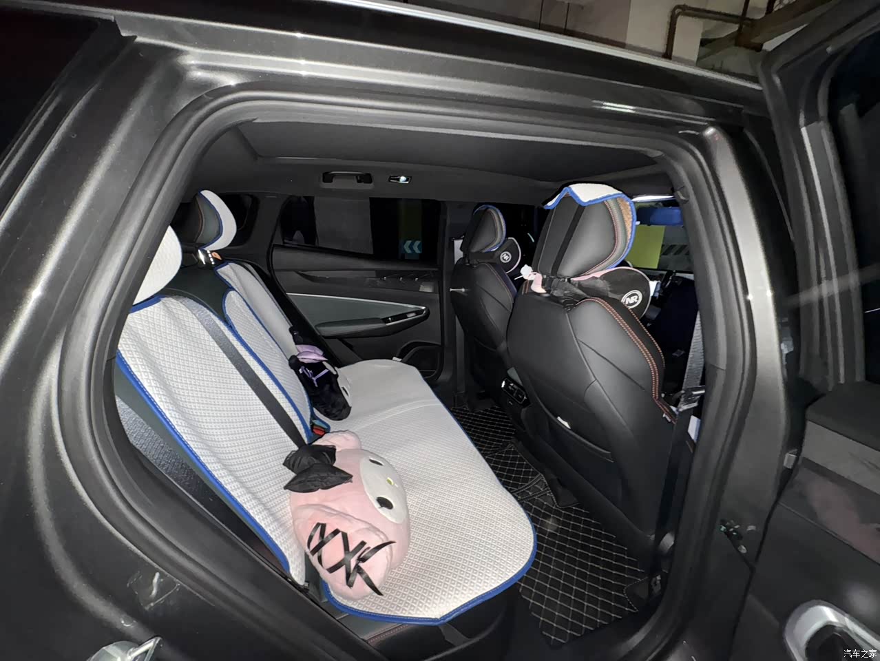 内饰的话可惜没有了23款的白色,不过这个青绿色也还行耐脏,这椅子个人感觉像个电竞椅的感觉,还不错舒服柔软,智联十没有后排中间扶手不过对于两个人来说也用处不大,大屏幕看东西也方便,后排放到还能放不少东西