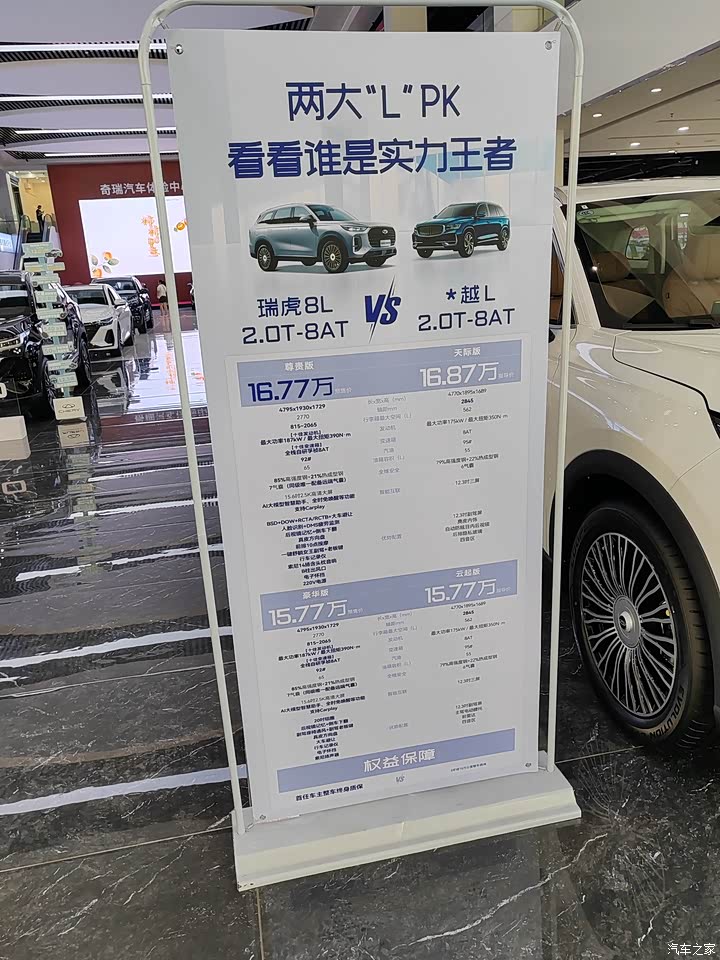 两大L车系的PK对比,瑞虎8L在配置方面更胜一筹。瑞虎8L的官方指导价为12.99万-17.49万元. 目前部分地区有不同程度的优惠政策,如南宁、阜阳、亳州等地购车最高可享现金优惠1万元,最低起售价降至11.99万元. 台州天鹰奇瑞汽车曾推出限时活动,2000元定金可抵扣10000元购车现金红包,还可享至高15000元置换补贴、价值10000元整车终身质保、2年免费娱乐流量+终身免费基础流量及免费道路救援等。