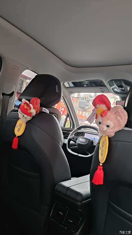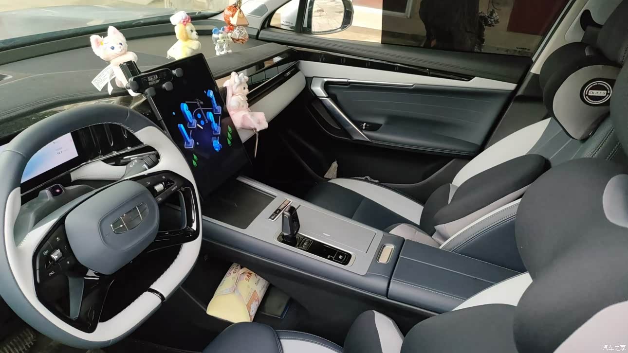 内饰颜色还是可以的也是带点灰色和我车外观的颜色一致,中控台哪,全靠一个大屏幕很智能化,就是一个档把,其他就是储物的,简洁大方但又不简单呀,哈哈,没有实体按键,想打开啥调节啥,全靠中控屏,可语音控制,可手动调节,但凡可以动口为啥动手呢,多麻烦哈哈,所以语音交互系统这个挺安全方便的,氛围灯也是很酷炫的,音乐律动的还是,下次专门给你们录个视频看看,内饰材质的话基本都是软包,看着更有质感和高级感。座椅都是打孔工艺,而且说是只有我这配置的才有前排座椅通风功能,而且前排座椅还能加热,等过段时间天更冷了,试试看,要是再能有个方向盘加热会得劲儿,