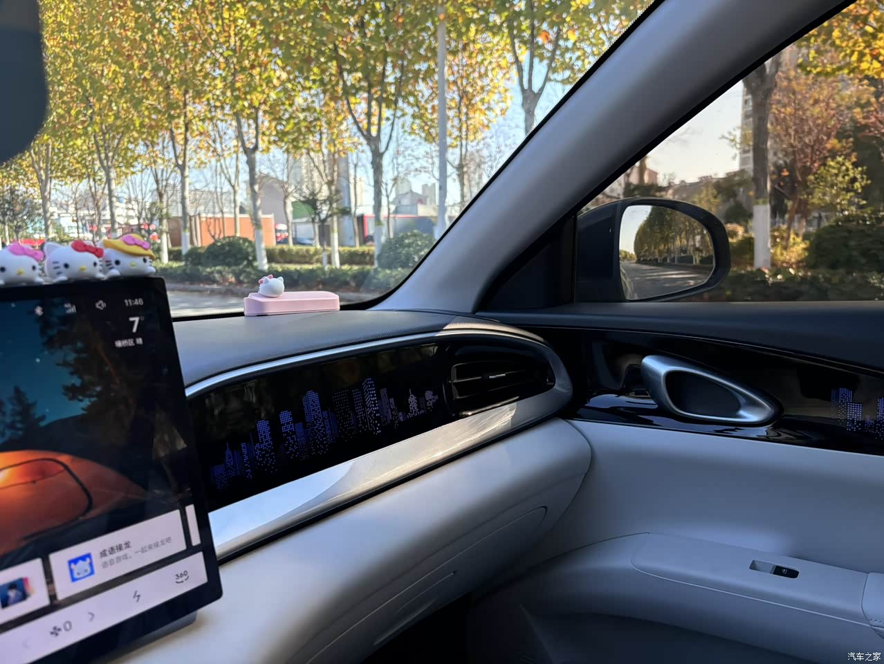 让人请轻松愉悦的空间体验,一切都恰到好处,简约而不简单,出风口放了kitty猫的香薰,可调节的氛围灯,可调节深浅的仪表盘,壁纸也可以自己网上下载好之后放到车机屏幕,化妆镜主副都带灯光。