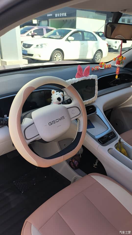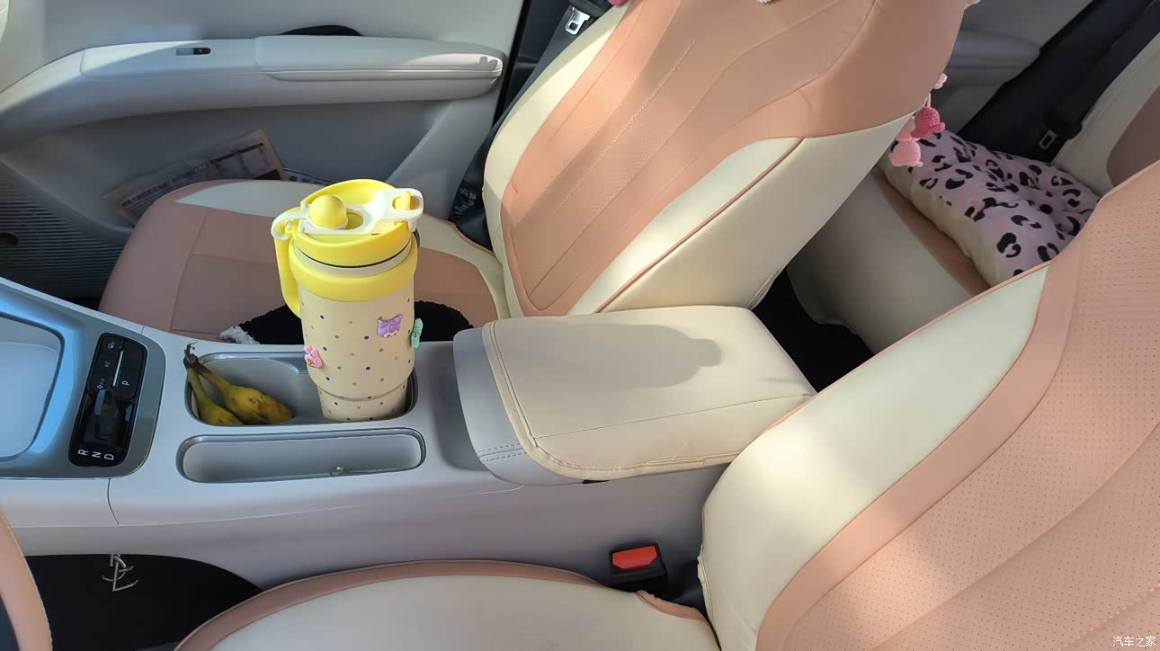 外观是粉色的,里面是白色的内饰,所以我就买了一个皮的坐垫,套上去和外观整体是非常很搭的。