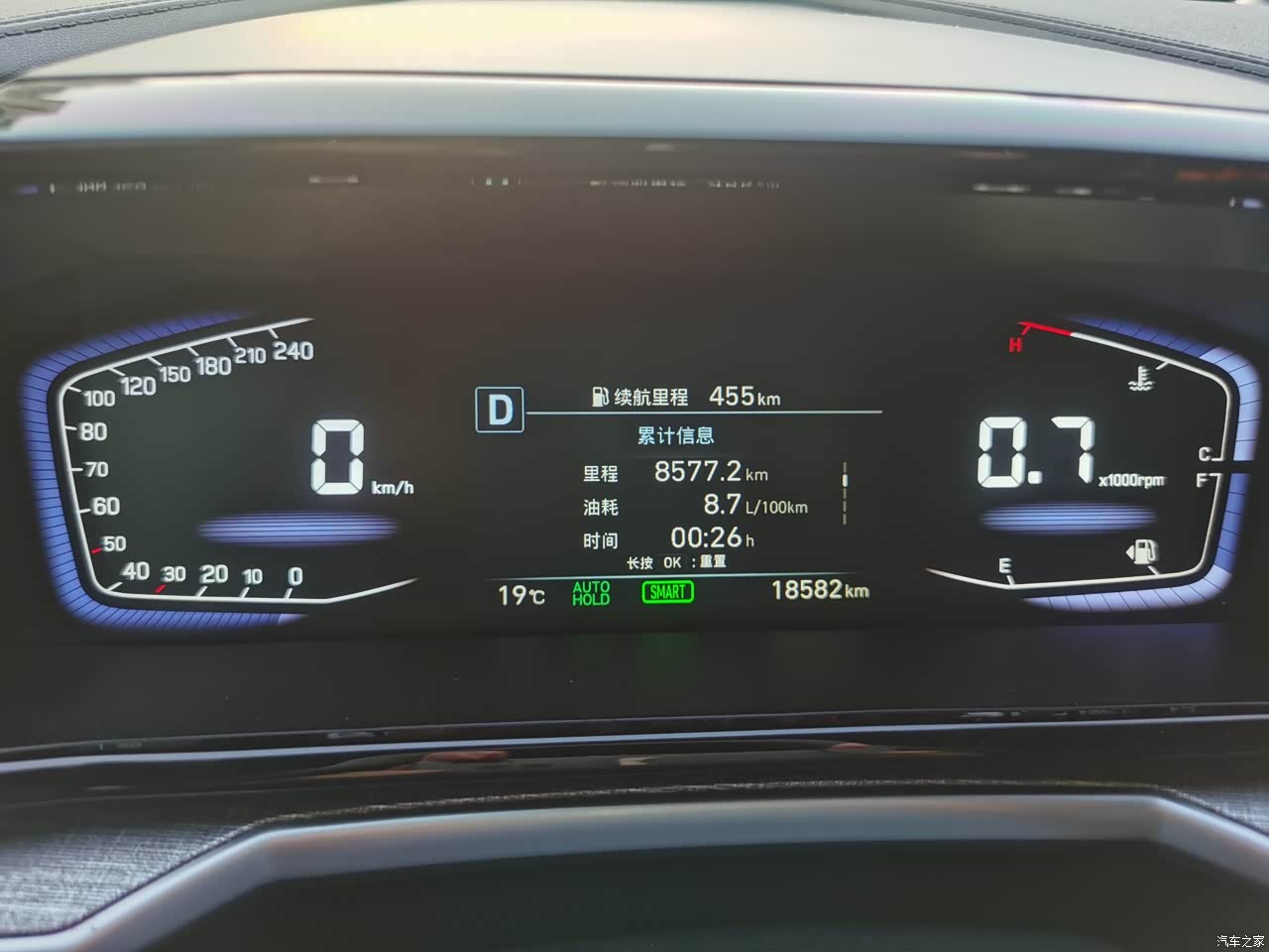 至于油耗方面,因为是早晚高峰期的道路问题所以油耗会略高一点,这个时候油耗可能在10点几的样子,但是正常市区道路开开一般是8点几的样子,如果是跑高速和快速路的话百公里油耗也差不多是6.5的样子,我现在表显的综合油耗差不多在8.7的样子。