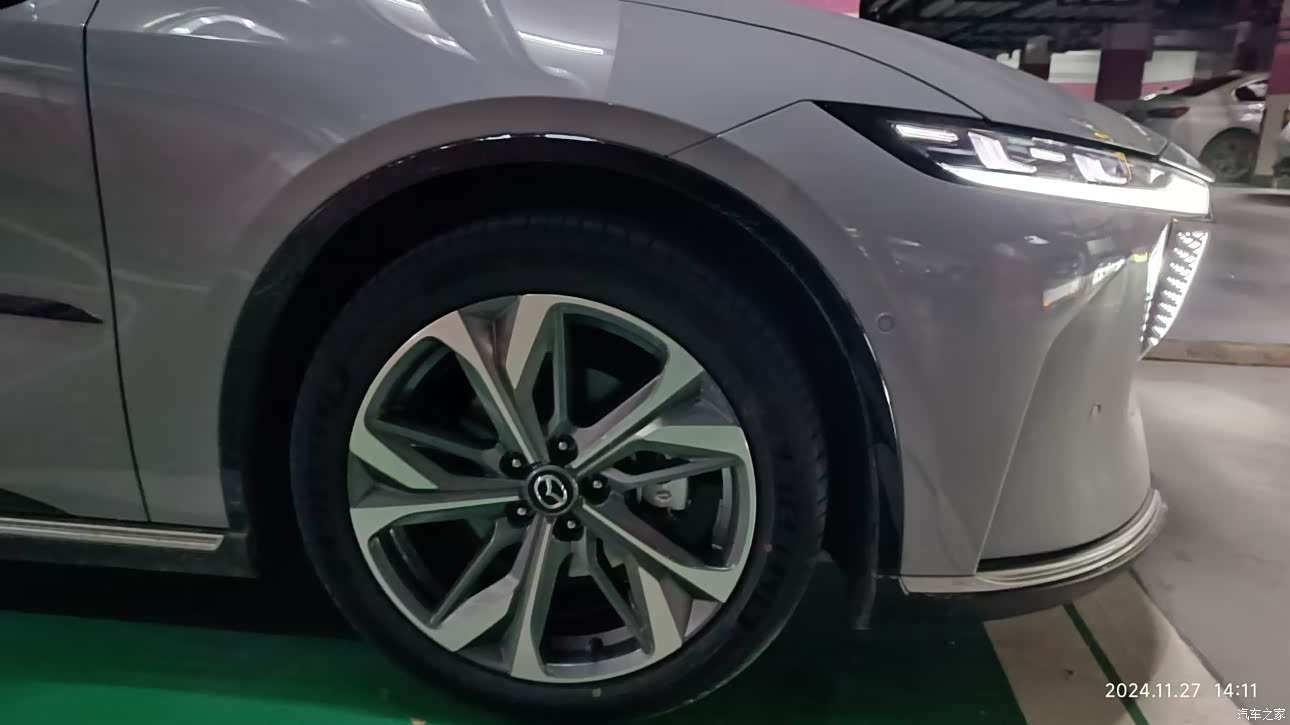车身的比例还是马自达做的好,线条优美,车尾的这个尾翼是没想到的,没想到保守的马自达也很潮,还有这个前脸也很科技感,特别有识别度,尾灯也喜欢,虽然也是贯穿式的但是两边的圆灯还是很经典的,还这19寸的大轮毂