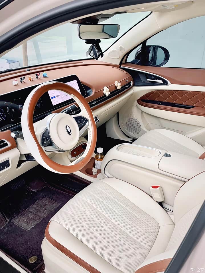 欧拉好猫的内饰设计充满了复古与科技的结合感,车内的大面积软质材料和精致的拼色设计使得整个内饰氛围非常舒适、温馨。