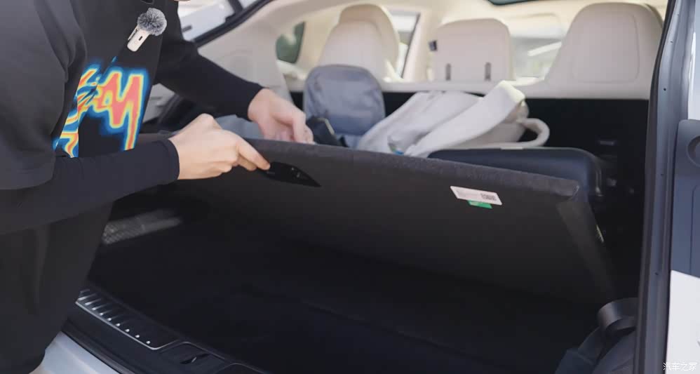 本人183身高,前排是我的坐姿,然后我感受了一下后排的空间。膝盖和前排座椅3拳距离。然后头部,头发支楞起来还有一拳,不支楞有一拳半,这就是4956车长2950轴距带来的巨大空间,后备箱也非常的大,并且它还有3层,最大上面的层,还有二层空间,有一个匾,再往下还有一个更加下沉的三层空间,它们加起来之后,整个容积非常的大,整个后备箱容积三层加起来有837L,如果你把第二排放倒,那就是2000多升的容积。储物室没有任何问题,携带能力非常强,它可以放三个28英寸的箱子,加上两个22英寸的。最后最下面第三层还能再放一个20英寸的登机箱,所以人的空间大,物的空间也大。