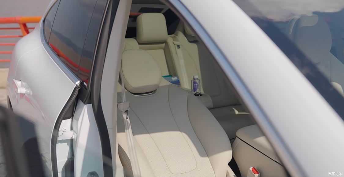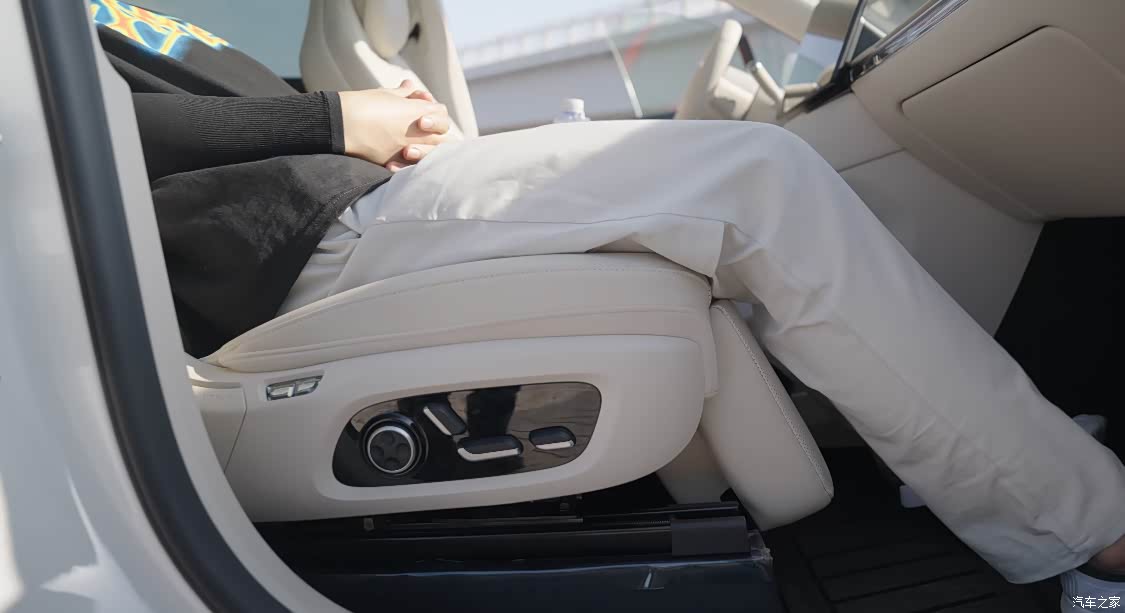 门把手是触摸感应的,你的手只要搭在门把内侧就自动弹开,前后都是无框的双层玻璃,静谧性非常好,玻璃有很好的防晒的性能,但我依然感觉搭配的物理遮阳帘防晒最为直接。还有就是电动可调的后背也很方便,整个座椅布置还有一个亮点就是副驾的0重力座椅,腿托是很长的,并且腿托自带加热,并且这两个大的钝角是123°,甚至比M9的121°还要大一点哦,方向盘的这个上下的距离变得更大了一些,就是它更接近于传统圆形的方向盘的感觉。副驾驶的这个手套箱有了上下双层的设计。它的上层是物理的方式,下层是电开,并且你可以设置密码,是非常隐私的设计,还是非常实用的。